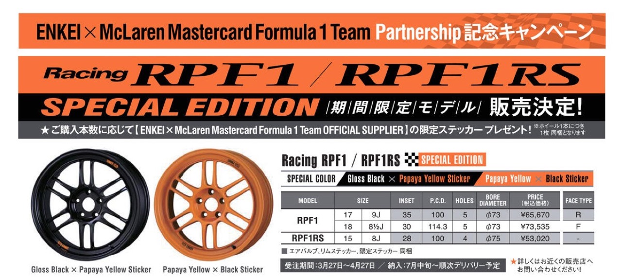 日本輪圈巨頭 ENKEI 正式宣布與 McLaren Mastercard Formula 1 Team 深度合作,推出以 F1 車隊塗裝為靈感來源的限量版鋁合金輪圈系列。這次登場的型號包括改裝界常青樹 Racing RPF1 以及復古運動風格的 RPF1RS。兩款限量型號均採用了 McLaren 最具標誌性的「Papaya Yellow」木瓜橙色與黑色進行交織設計,將頂級賽車運動的視覺衝擊力從賽道帶到一般街道。