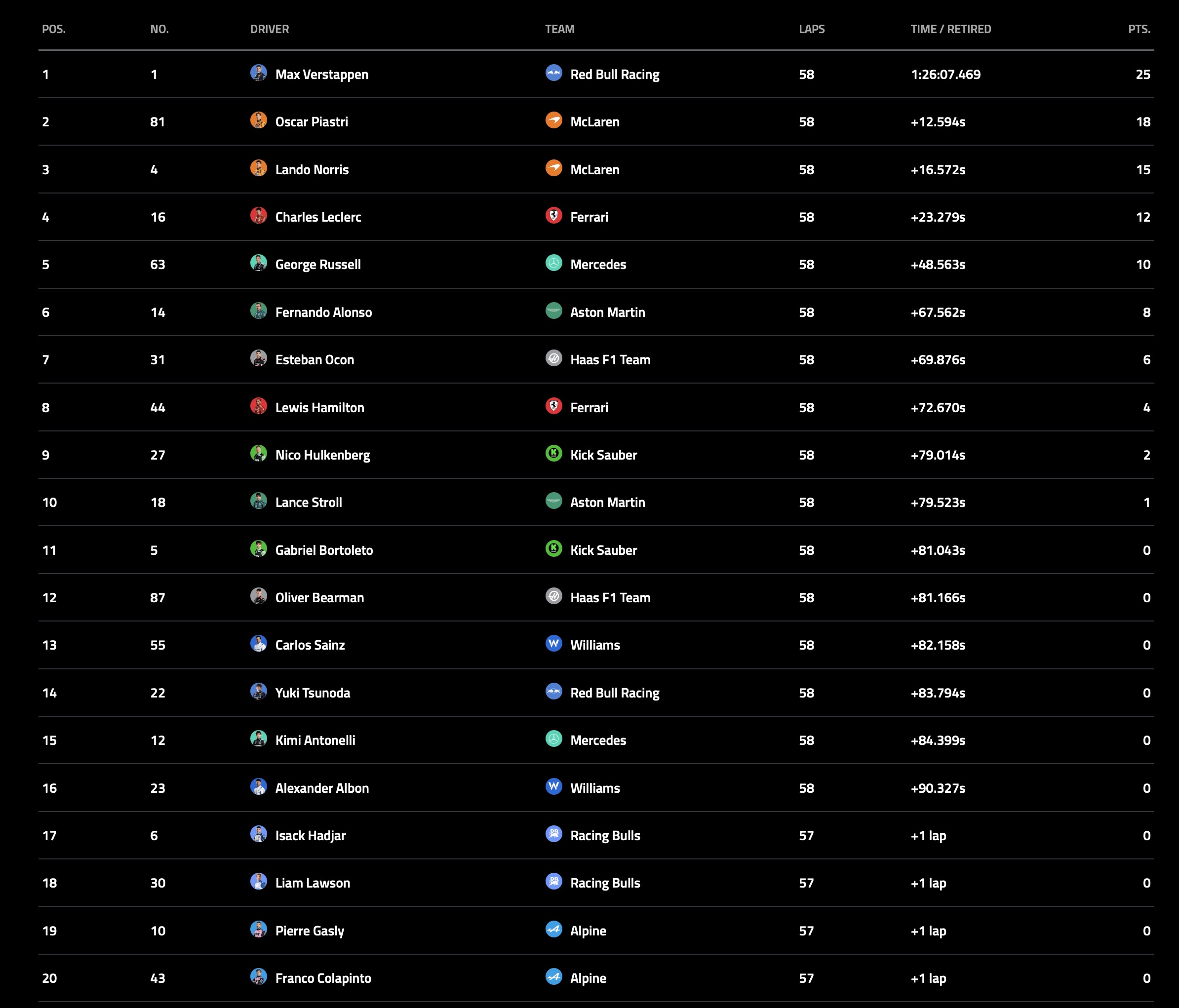 從觀眾席上的普羅大眾到圍場內的專業人士,今晚的感受截然不同。對於現場車迷而言,這是一場視覺盛宴,見證了新王的誕生;對於車隊策略組來說,這是一場關於數字與概率的極限計算;而對於像 Kick Sauber 這樣最終顆粒無收的車隊來說,則是殘酷競技體育的真實寫照。每個人都在這場時速 300 公里的博弈中,看到了屬於自己的故事。Verstappen 賽後無奈地承認自己需要運氣,但 F1 從來不相信運氣,只相信實力與積分。