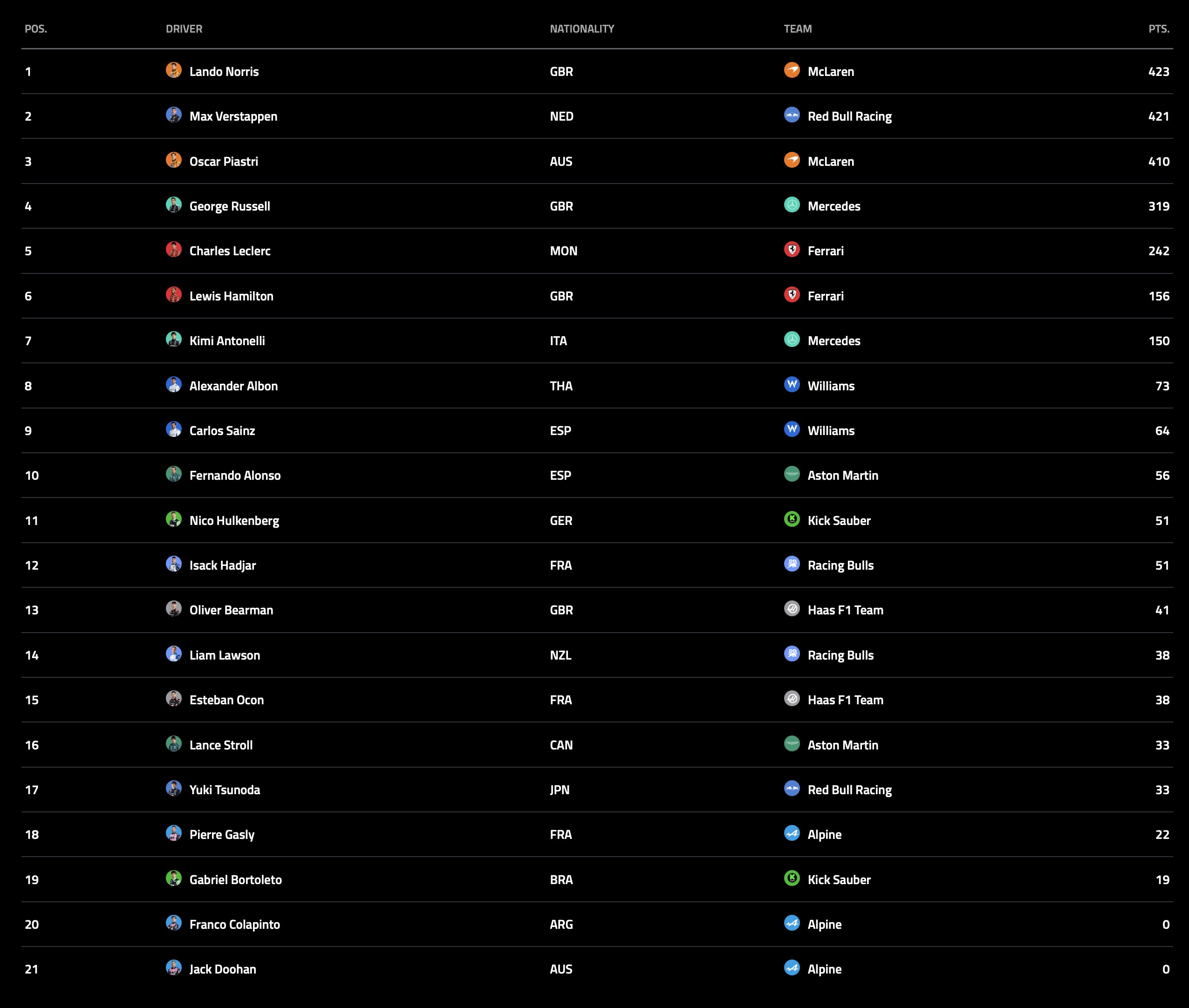在於衝線的一刻。經過 58 圈的長途激戰,Norris 成功抵擋住來自後方的所有壓力,以第三名衝線。這一結果讓他在積分榜上以僅僅兩分的微弱優勢,力壓 Verstappen 登上世界冠軍寶座,而隊友 Piastri 則以 11 分之差飲恨。這場比賽不僅是 McLaren 車隊動力單元與底盤設計的勝利,更是車手在極限狀態下對機件操控的完美演繹。後方集團同樣精彩,Leclerc 獲得第四,George Russell 為 Mercedes 守住第五,而身披 Ferrari 紅色戰衣的 Lewis Hamilton 則在第 250 場出賽的 Nico Hulkenberg 之前,以第八名完賽。這場比賽的數據流動,精確得如同最精密的引擎運作,少一分都足以改寫歷史。