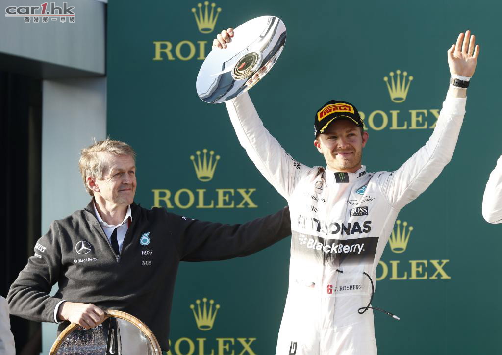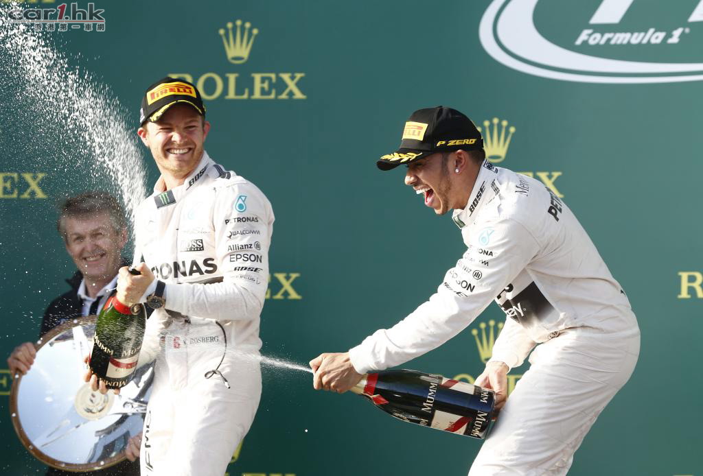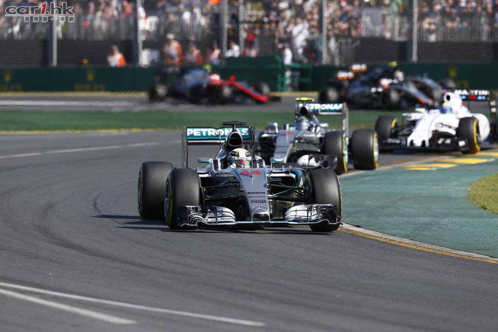 F1 2015 年首站比賽終於在澳洲完成,大熱門 Mercedes-AMG F1 車隊首站旗開得勝,英國車手咸美頓以 1 小時 31 分 54 秒 067 完成賽事,他的隊友羅斯保比他只是慢了 1.36 秒,站在亞軍位置。今年躍進的法拉利,憑著四次世界冠軍維特爾寶刀未老,獲得首站的第三名。雖然維特爾獲得第三名,但是總時間比 Mercedes-AMG 慢上 34 秒 523 之多,可見平治戰車實力跟法拉利有一段距離,儘管各車隊在頭三分一甚至一半賽季都是調校車子的話,但相信平治在現有規則比賽下,仍然有大量優勢,甚至未出盡全力,各車隊戰車實力仍有待觀察。維特爾今次憑戰術把握換胎良好時機,令他由第四追趕威廉士車隊的馬沙,馬沙最後第四位完成比賽。