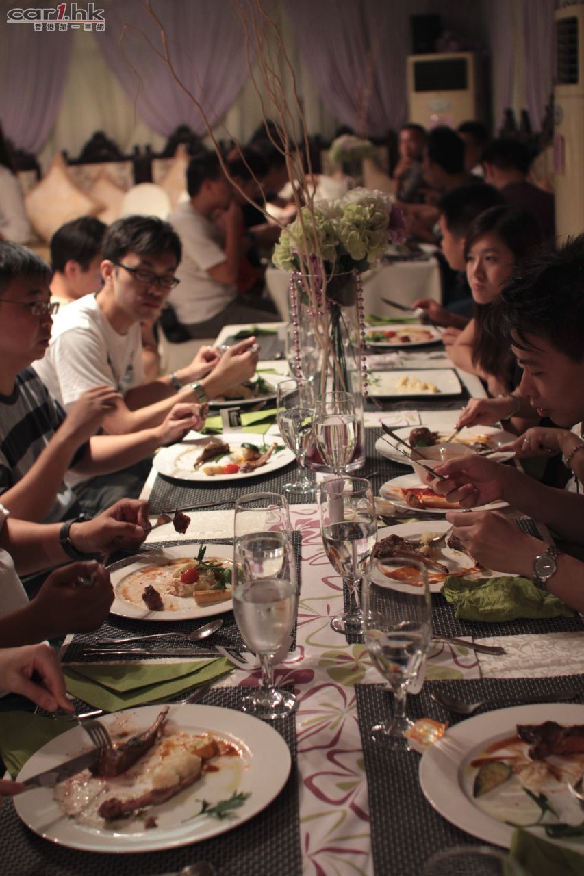 大合照完,會員紛紛出發到聚餐地點,吹水既吹水,玩 GT5 既都有。晚飯的高潮當然係大抽獎,經過幹事既細心挑選,桌面上的禮物都令眾會員流口水,獎品大部份都係汽車模型同玩具車仔,適合眾會員口味,重有贊助商送出禮物,目不遐給。全晚氣氛非常熱鬧,會員都盡興而歸,不過未夠喉,由於餐廳環境非常優美,會員決定黎多一張大合照,更加搵黎白馬王子RX-8做背景,一絕!