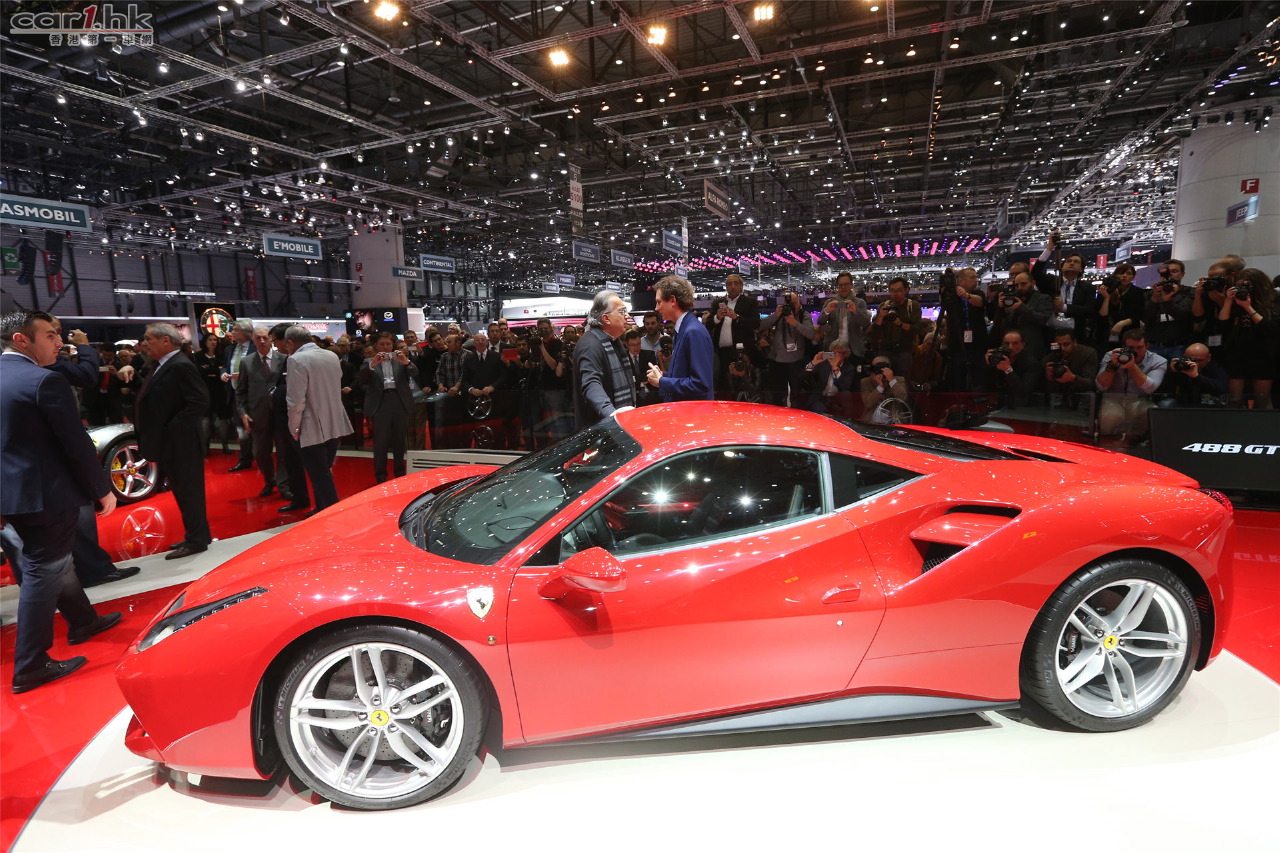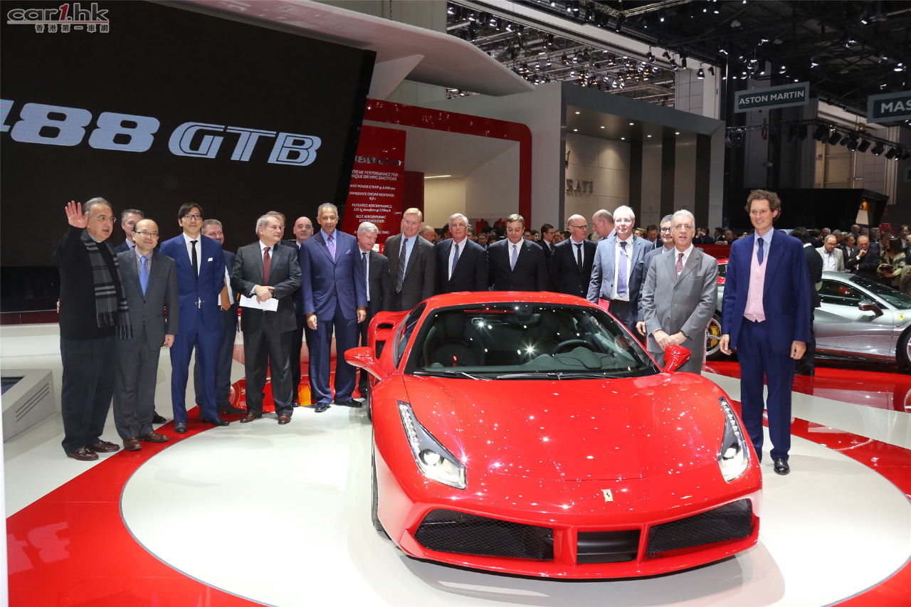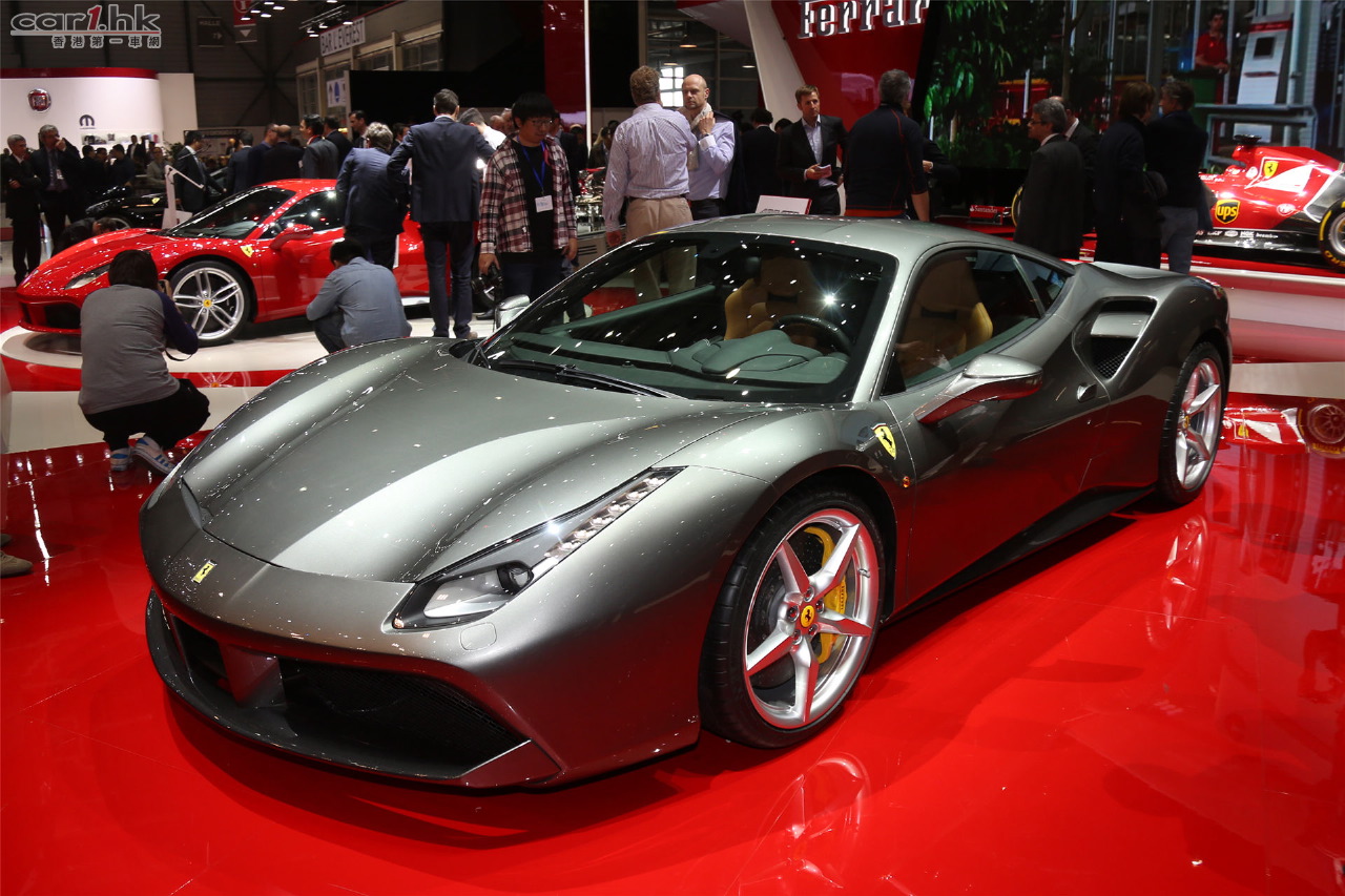 在本次車展首次亮相的兩部法拉利488 GTB中,一輛身披全新賽道紅塗裝,搭配紅黑相間的高科技碳纖維面料內飾,另一輛則以金屬灰塗裝配合傳統黑棕皮革內飾示人。