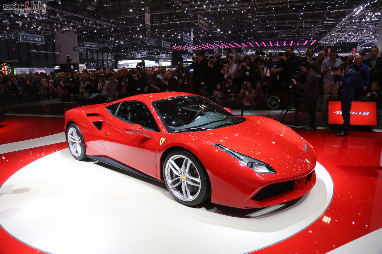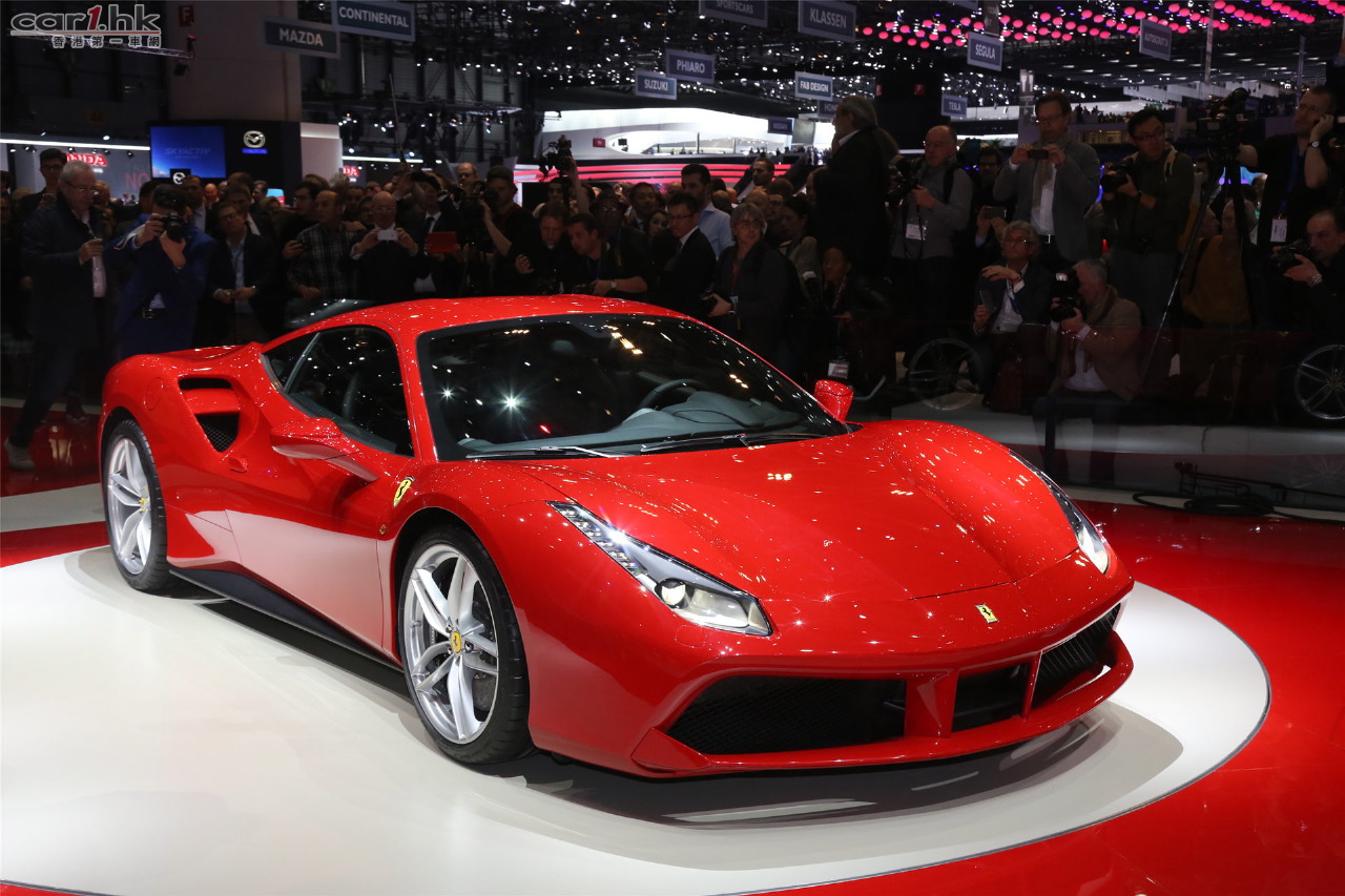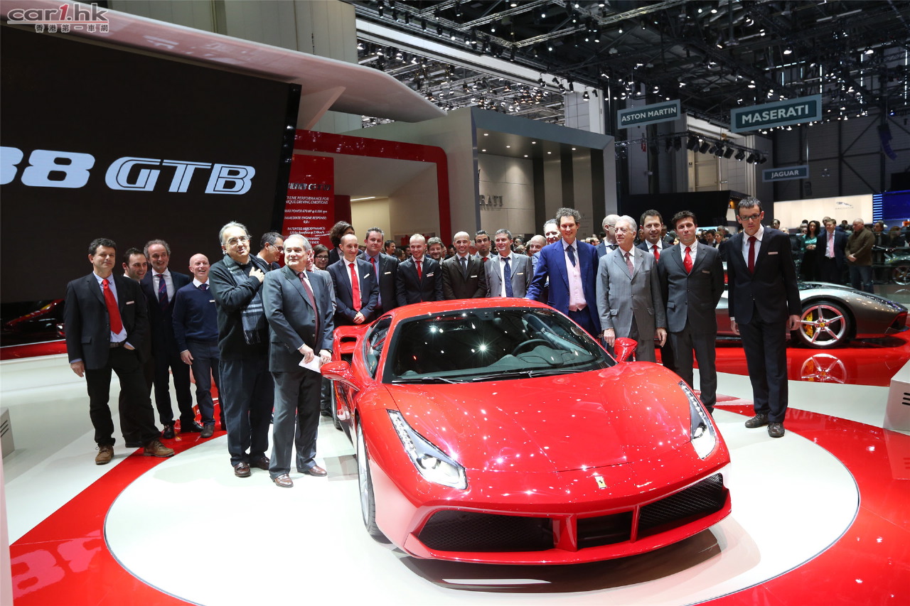 在本次車展首次亮相的兩部法拉利488 GTB中,一輛身披全新賽道紅塗裝,搭配紅黑相間的高科技碳纖維面料內飾,另一輛則以金屬灰塗裝配合傳統黑棕皮革內飾示人。