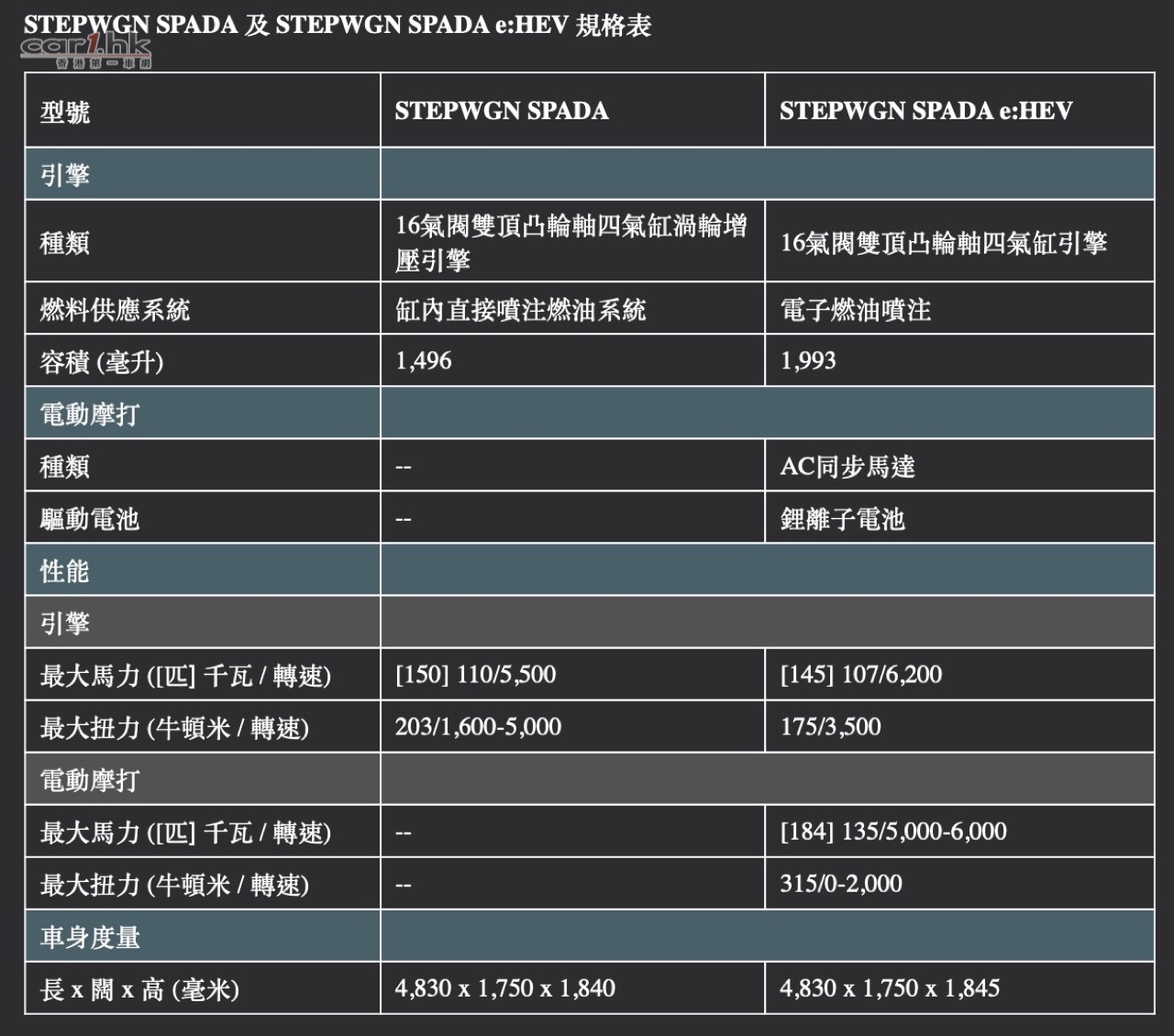 混能版本STEPWGN SPADA e:HEV 搭載了本田獨有 Sport Hybrid i-MMD ( Intelligent Multi Mode Drive ) 動感混能系統,以2公升 16氣閥雙頂凸輪軸四氣缸Atkinson 循環汽油引擎,配合雙AC同步摩打,新一代鋰離子電池及 e-CVT 自動波箱所組合,輸出最大馬力184匹及峰值扭力315牛頓米。e:HEV系統可按實時所需,智能切換不同動力模式,包括靜止起步及慢速行駛時的「純電 EV 模式」、一般駕駛情況常用的「混合動力模式」以及高速巡航時啟動的「引擎模式」。行車模式可選擇使用D-Range 自然減速模式 或 B-Range 減速輔助模式,使用D-Range時可用真皮軚環上設有的撥片調節減速強度,令下坡時可減少制動操作。 STEPWGN SPADA e:HEV 糅合爽快駕駛感及低油耗表現,綜合油耗逹致 20.3km/L (按WLTC mode標準計算) ,極致展現本田新一代油電混合技術結晶,令本田 MPV 的操縱性能提升至更高層次,並為 MPV重新訂下新基準。