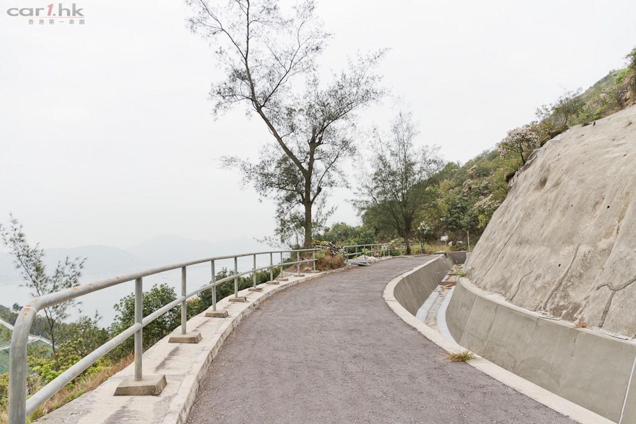 在燒烤場旁邊有一條不知名小路,小路只得一條行車線,而且沿路沒有太多避車處,幸好筆者兩次去探路時都沒有遇到太多對頭車。整條小路旁邊有一條引水道,加上小路比較窄,某些路段的灣位兩旁都有一些矮石壆,駕駛車型比較大的朋友需要小心刮到車鈴或車身。沿住小路向前進發,有很多位置都可以望到下方的屯門公路,遠少少可以望到柏麗灣,汀九橋和青馬大橋,如果天氣好的話更可以望到香港島。由於筆者駕駛的是七人車,過了小路頭段之後,有足夠空間給我掉頭的位置不多,所以索性一直向前行,大約六分鐘後便會到達此路盡頭。這裡的空間比較大,大約足夠兩至三輛車停泊。基本上這裡望到的風景跟之前提到都是一樣,不過因為可以泊低架車,所以亦都可以為愛車留倩影,如果沒有太多煙霞的話更可以拍下正前方的無敵大海景。