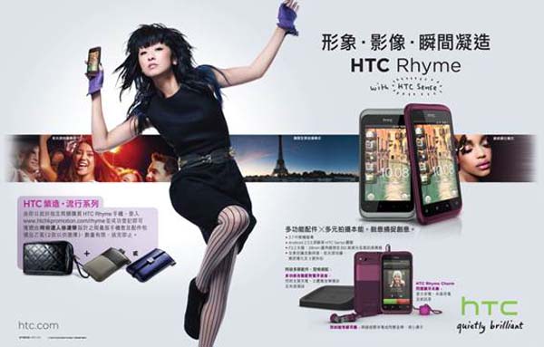 HTC Rhyme 專為獨具品味的消費者量身打造,兼具先進的功能與流線的設計。擁有時尚典雅外型的 HTC Rhyme 完美融合鮮明色調,包括澄澈水感的湖水藍(Clearwater)及梅子般的胭紫紅(Plum),以及專屬的手機配件,包括多功能自動配對藍牙底座、HTC Rhyme Charm閃燈顯示吊飾及防糾結有線耳機,讓使用者自在地表現出個性化的自我,同時與您分享徐濠縈別樹一格的時尚品味。
