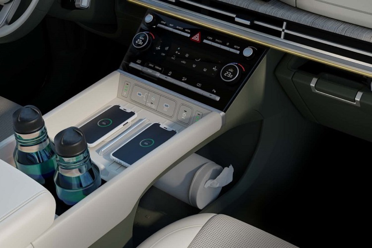 而現行的Santa Fe只提供兩排座椅配置,但現代汽車表示新車型將提供第三排座椅。照片顯示這是一種兩排座椅配置,第二排座椅可平放在地板上。內飾比以前高檔得多,同樣帶有陸羅漢風格,將提供Nappa皮革、兩個12.3英寸屏幕和兩個中央控制台無線充電座。