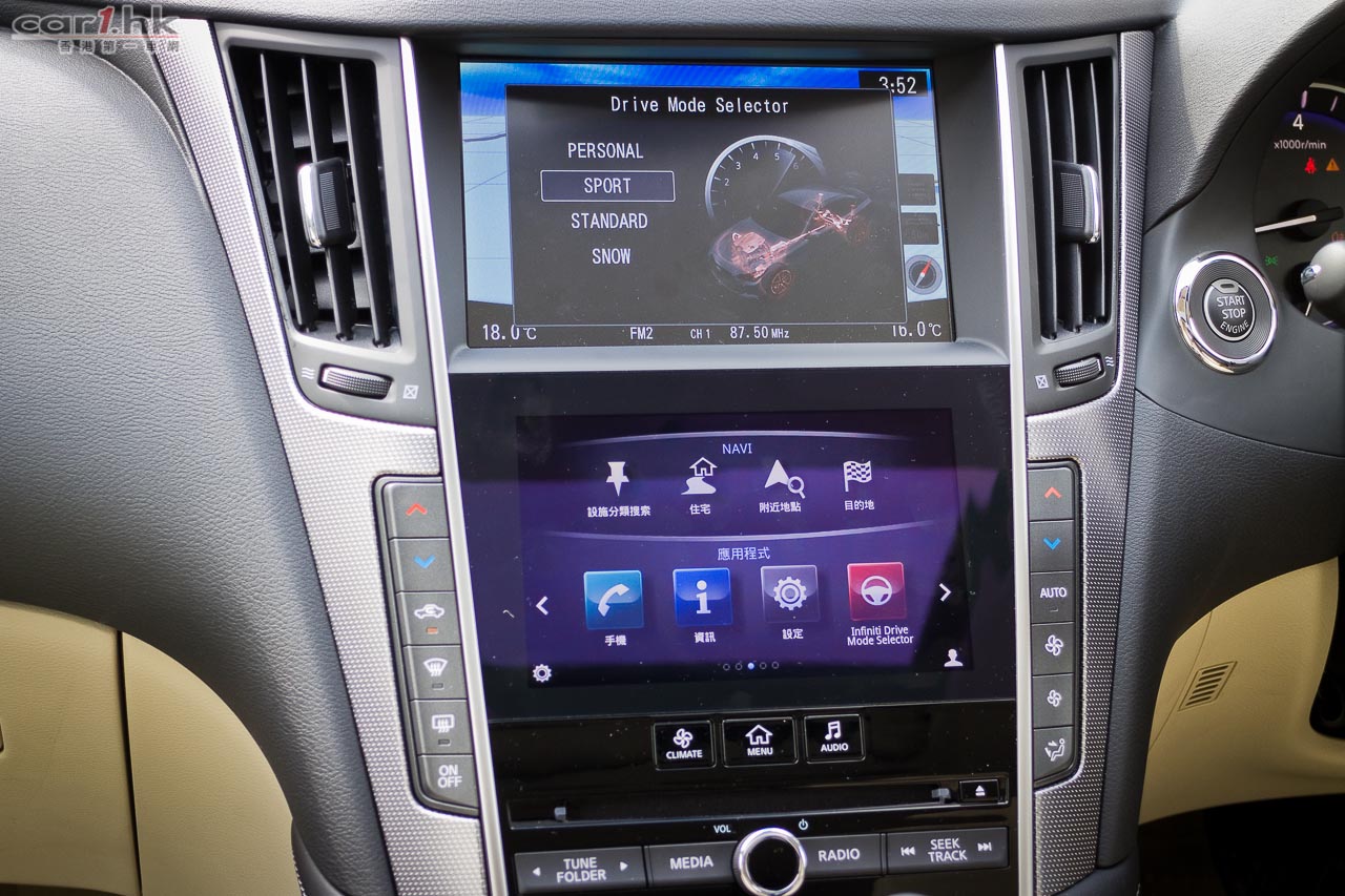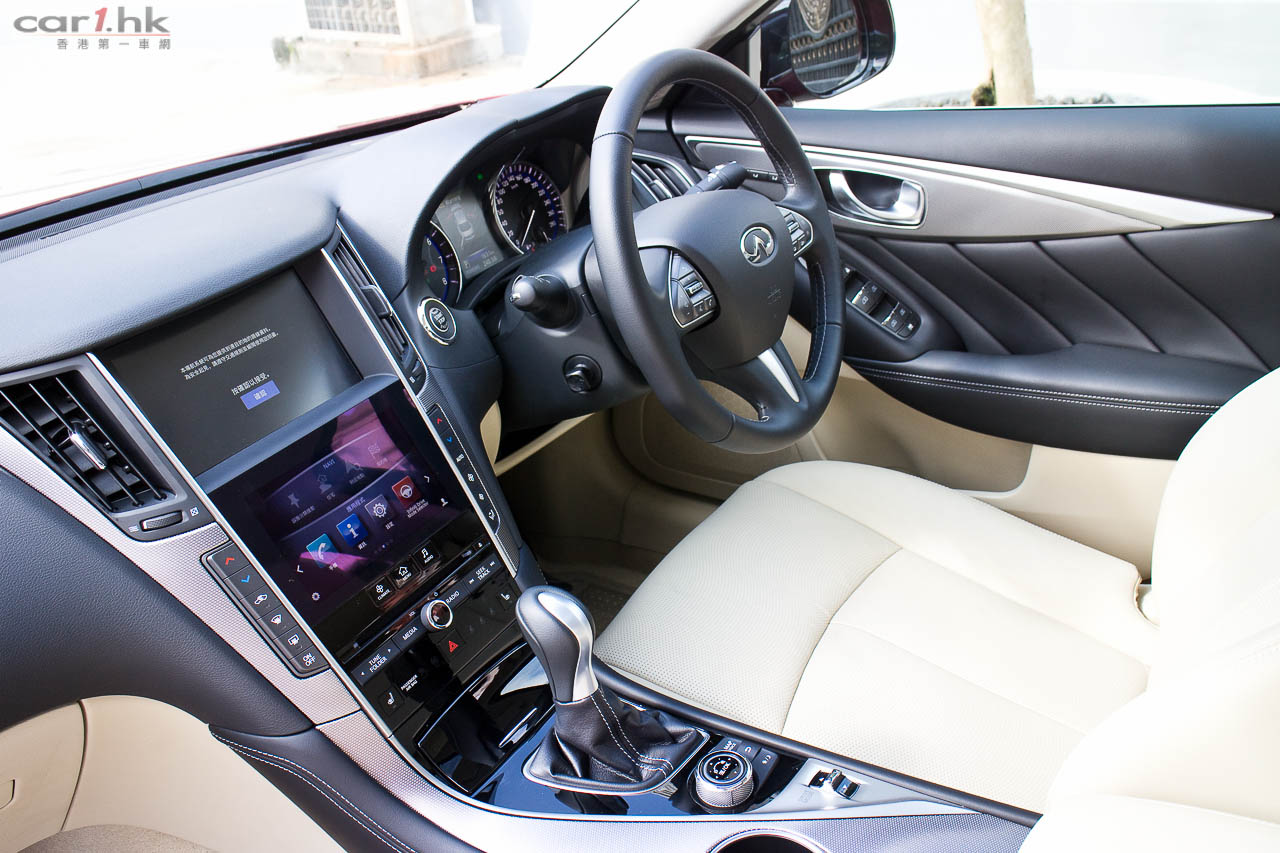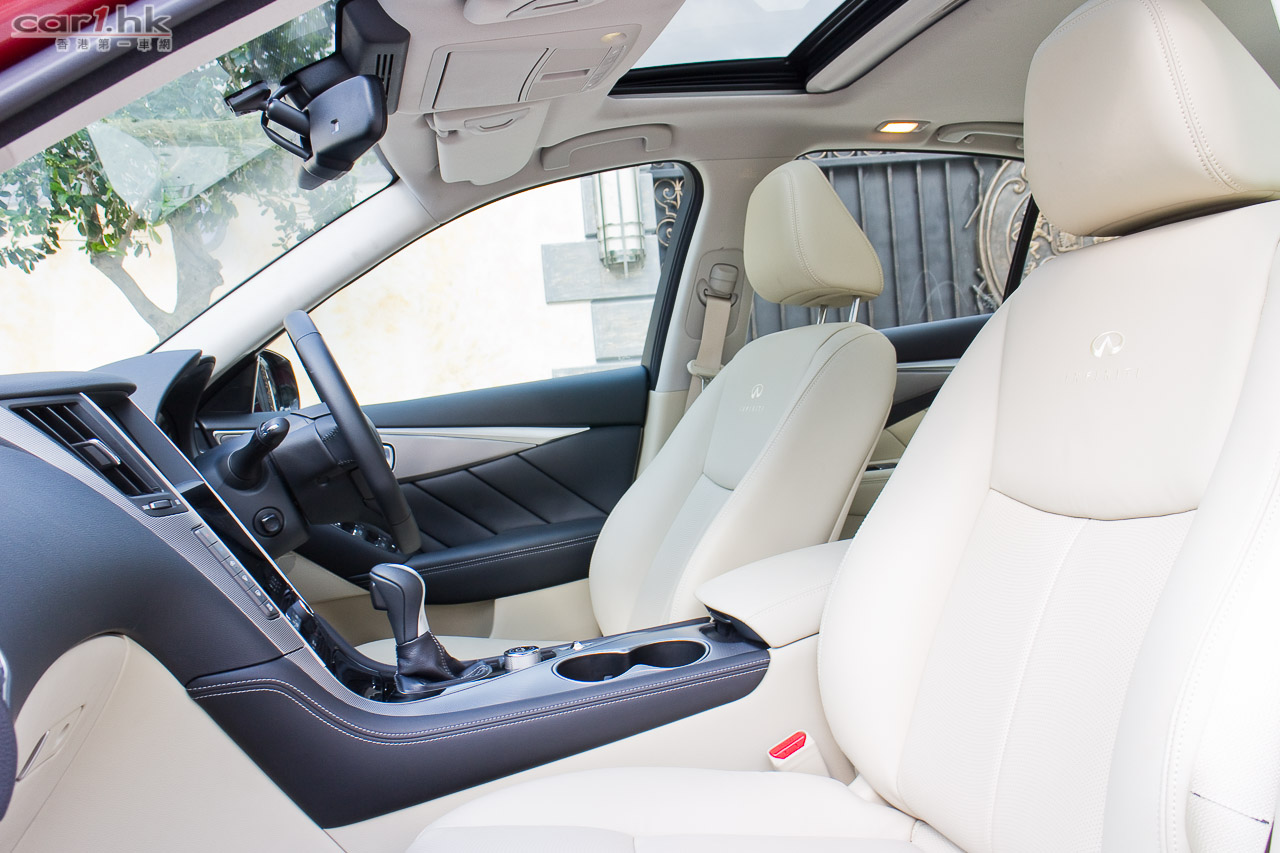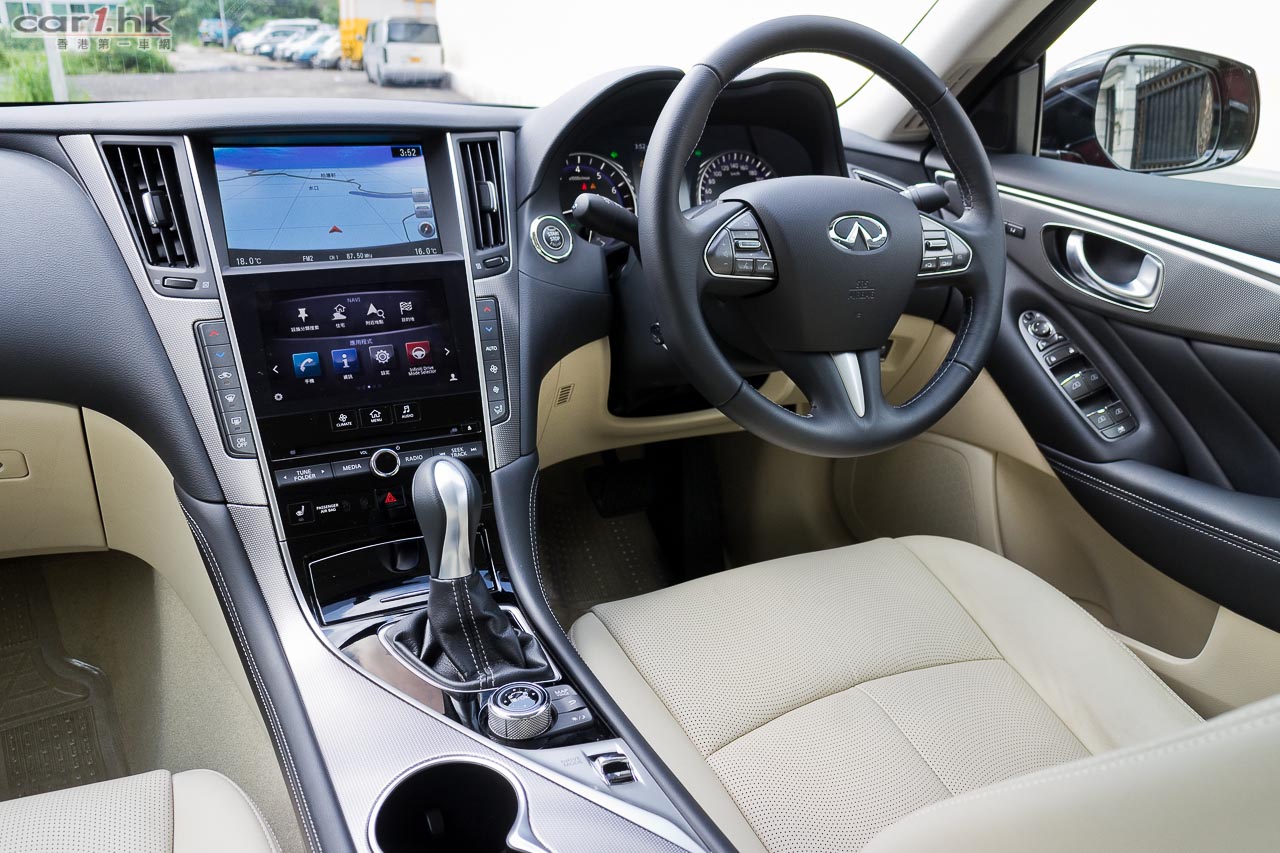 著車時,錶板指針會先旋轉,錶板中的彩色 LED 屏幕會顯示 Q50 的動畫,未開動已經給駕駛者一點動感感覺。Q50 2.0t 是與 Mercedes-Benz 平治合作,平治提供她們的 2.0 公升直四渦輪增壓引擎給 Infiniti,而這副引擎早已應用在 E250、A 250、CLA 等車型。馬力輸出達 208 匹、峰值扭力為 350 牛頓米,在 1,250-3,500 轉時可以全數釋出。波箱方面,亦是由平治提供的,使用 7 速半自動波箱,雖然反應不錯,但是未有提供軚盤轉檔撥片筆者有點遺憾,因為試駕時覺得這部車運動感很強,起步時的爆發力亦很出眾,擺脫了同級車的斯文風格。軚感回饋反應自然,亦沒有日本車常見輕飄飄的問題,快車開起來感覺實在。相信這些結果部份都歸功於 F1 車神 Sebastian Vettel 吧。大部份新設計錶板中央都有一個 LED 顯示屏,可以讓駕駛者設定不同顯示,但 Q50 偏偏沒有了行車車速,唯有靠錶板指針,感覺有點不太方便。另一方面,中控台方而找到指南針、G Force 力度計,玩樂和實用性都算照顧周到。代理表示,Q50 Hybrid 的設備更齊全,性能感覺更強,很快就可以安排試駕,大家請密切留意我們最新報導。