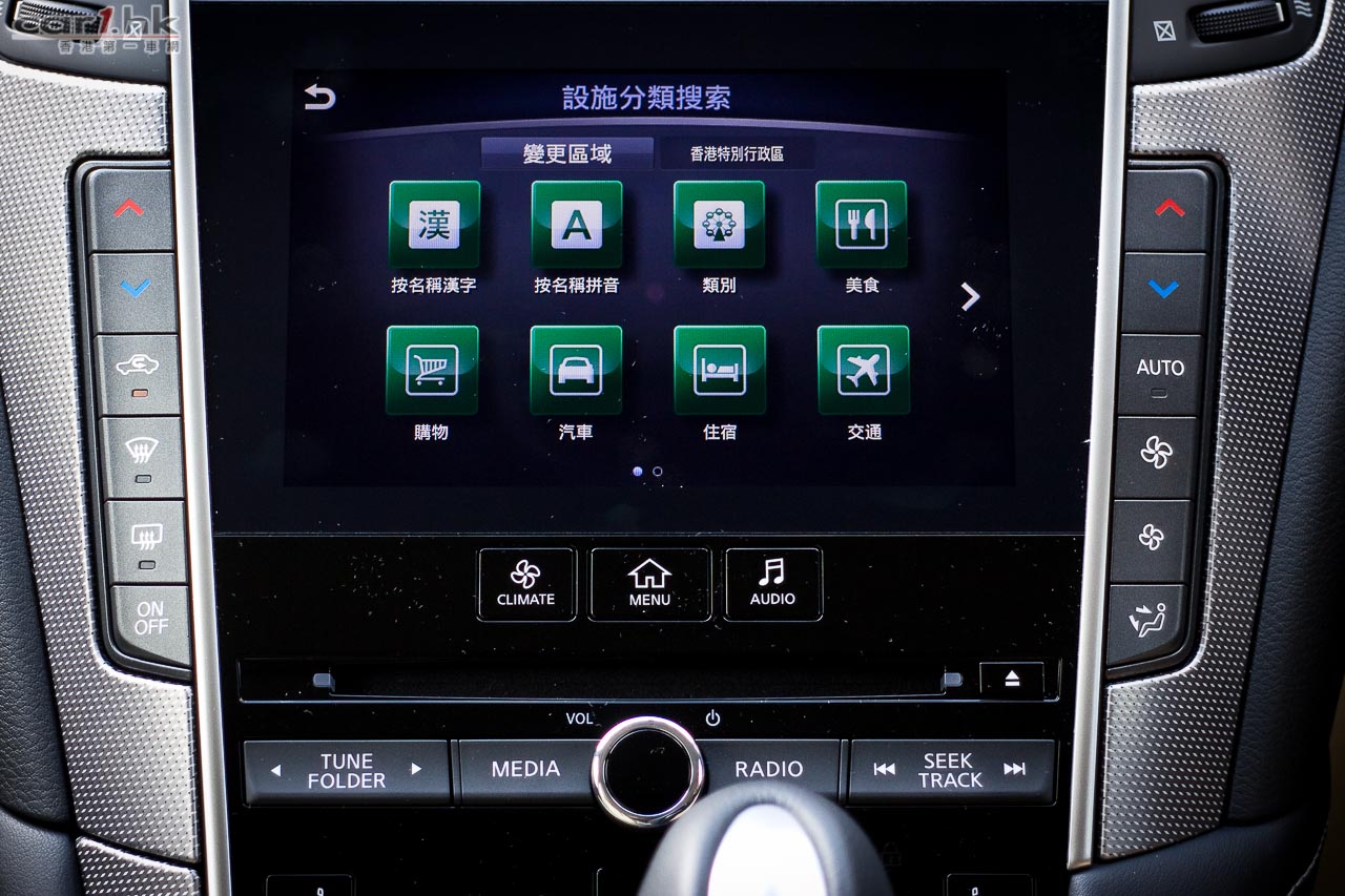在駕駛艙中,可以感受到 Double Wave 概念的前座空間包圍感不錯。全新的 InTouch 雙屏中控台相信對很多駕駛者來說都很雀躍,上下兩個屏幕,上為 GPS 和冷氣顯示,下為輕觸式中控台。雖然是輕觸式操作,但亦設有三個快捷鍵和轉盤去輔助,令到整體操作很周全,易用就手。這架頂級版,中控台平台加入兩種紋路銀色備件,大大提升它的科技感覺。另外,今次試駕 Q50 2.0t 時,它已經加入了 GPS 導航系統,地圖資料儲存在 SD 卡中,插入手枕內的 SD 卡槽即可。駕駛艙感覺令人討好,而後座的空間感也寬敞,其腳部空間多達 3 個拳頭的距離,伸展範圍絕對充裕。