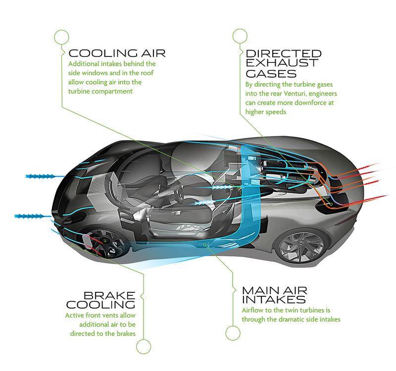 此外 C-X75 的車殼採用了主動式空氣動力學(Active aerodynamics)原理,所指的不僅是它在減低風阻及車重,而且從車頭泵把到後輪前方,兩邊同樣設有大型導風口,在行車時大量引入生風,直吹向制動碟及 Turbo 引擎箱,減少對水箱風扇的依賴。連同上述的怪異設計,讓「貓車」行走 1km 只排放 28g 二氧化碳。更不可思議是完全充電後,C-X75 最大航程可達 900km,假若有一條大直路,「貓車」是可以從香港跑往台北、河內、長沙、高雄等鄰近城市而不需作中途補給。除此之外 C-X75 與現有的新一代 XJ,整部車有 50% 鋁合金是源自回收鋁製品循環再造。
