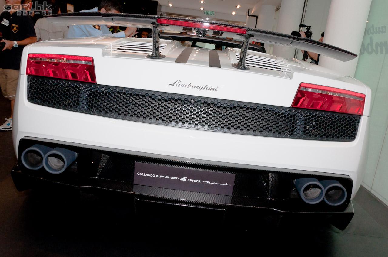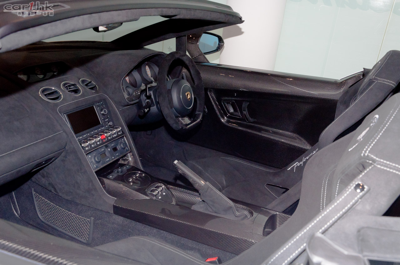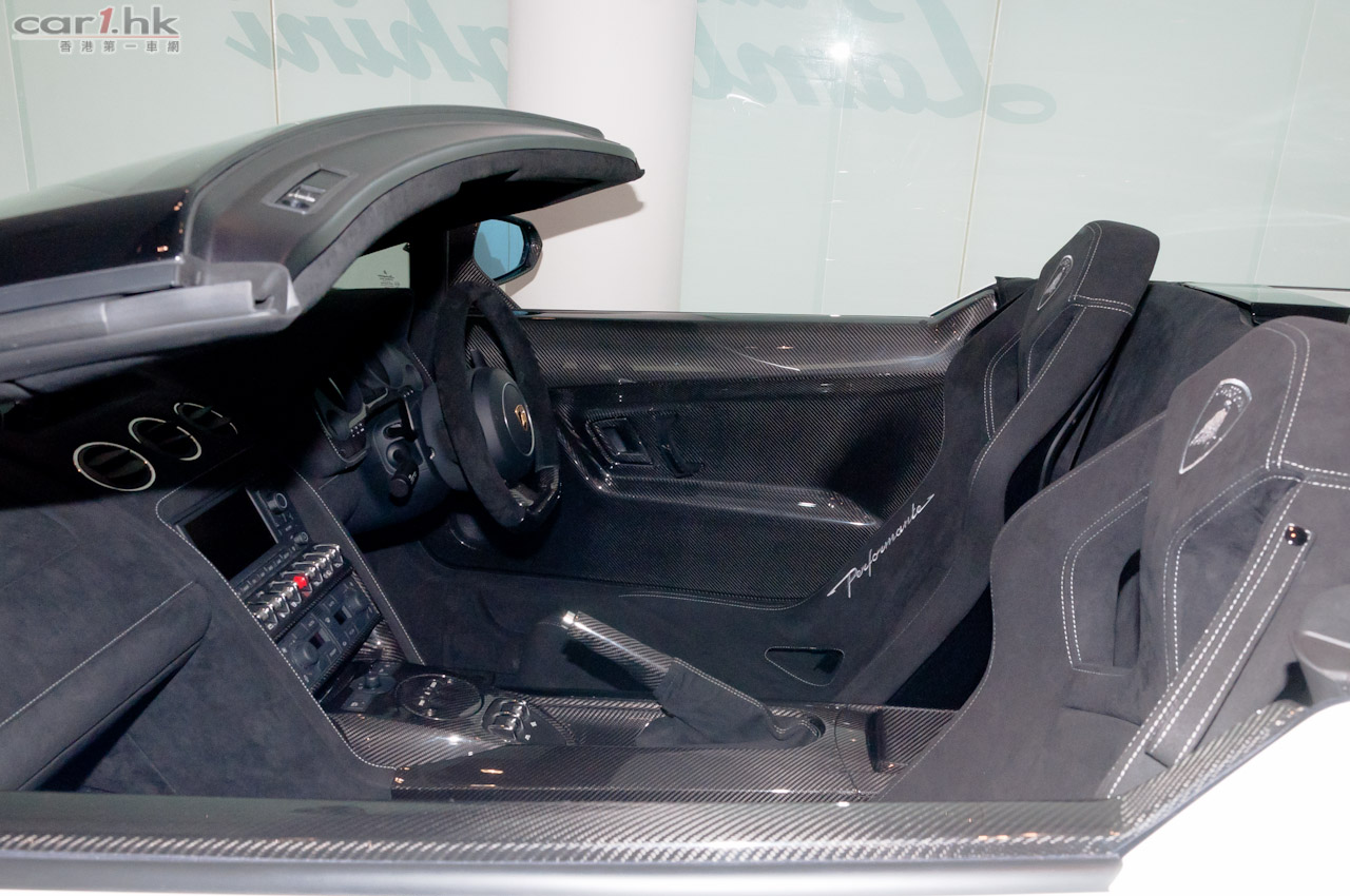 Lamborghini 在 9 月 2 日宣佈全新 Gallardo LP 570-4 Spyder Performanta 開篷超跑登陸本港!看到 LP 570-4 Spyder Performanta 時,不少人應該會把它視為 Gallardo Superleggera 的開篷版,兩者同樣擁有 570 匹馬力。但 Spyder Performanta 的工程師追求最佳的輕量化理念,因此車輛的內部與外部都採用了大量的碳纖維製成,如後引擎蓋、後導流板、車側定風翼、車底保護底板部件及外後視鏡框,都使用碳纖維製成;而內部的中央通道護板、車門面板、e-gear 手自變速器操作杆均由碳纖維製成。最終 Spyder Performanta 減輕了 65kg,車重不足 1,485kg,創造出 2.6kg/hp 的驚人馬力重量比。
