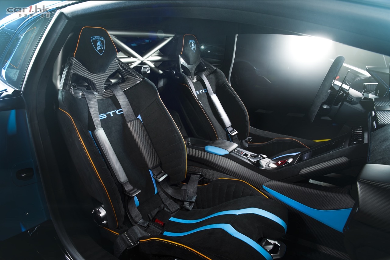 Huracán STO車型的內飾體現出與外觀相同的輕量化特徵。駕駛艙內大量使用了碳纖維材質,包括全碳纖維運動座椅、帶有林寶堅尼Carbon Skin的Alcantara材質內飾、以碳纖維地墊取代地毯,以及帶有車門開關的全碳纖維輕量化車門內飾板。帶有四點式安全帶的後部拱形支架和可用於收納頭盔的全新前部行李廂,能夠進一步凸顯Huracán STO的賽車DNA。林寶堅尼與技術合作夥伴Akrapovič共同研發的拱形支架採用優質鈦合金材質,與傳統不銹鋼支架相比重量減輕40%。
