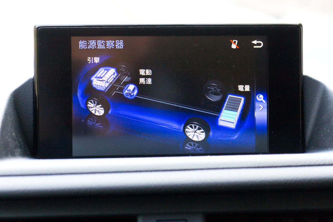 車子同樣有 EV 電動、ECO 節能、正常 Normal 和 Sport mode 四種駕駛模式,由波棍旁的旋鈕扭左、扭右制控。全電動 EV 模式可在 40km/h 以下以及夠電的情況下靜悄悄的使用,不過較適合在停車場內移動用,因在馬路上反應很慢,而且踩大點油四汽缸引擎便會自動撻著。進入 Normal mode,引擎和摩打混合驅動,錶版亮起藍色背景燈光,左邊的轉數錶位置會轉變顯示,顯示出「Charge… Eco… Power」hybrid 系統的運作;將鈕制扭右進入 Sport mode,錶版變回傳統轉數錶,5,500 轉紅線,背景燈光轉成紅色;車子得到「Sport」反應並非來自較敏銳的油門,而是電摩打由正常的 550 volts 電量增加至 650 volts 增強對引擎的輔助力,軚盤反應亦稍稍變重。車子除了錶板有指針顯示 hybrid 系統的運作外,中央顯示屏也有彩色圖像顯示電池充電狀况和引擎/摩打的驅動介入情況,與前一樣。