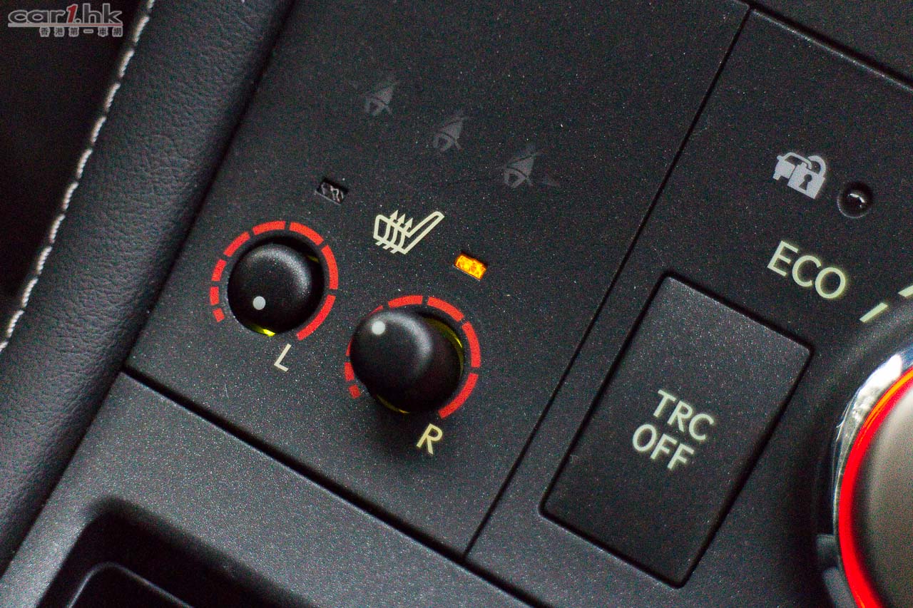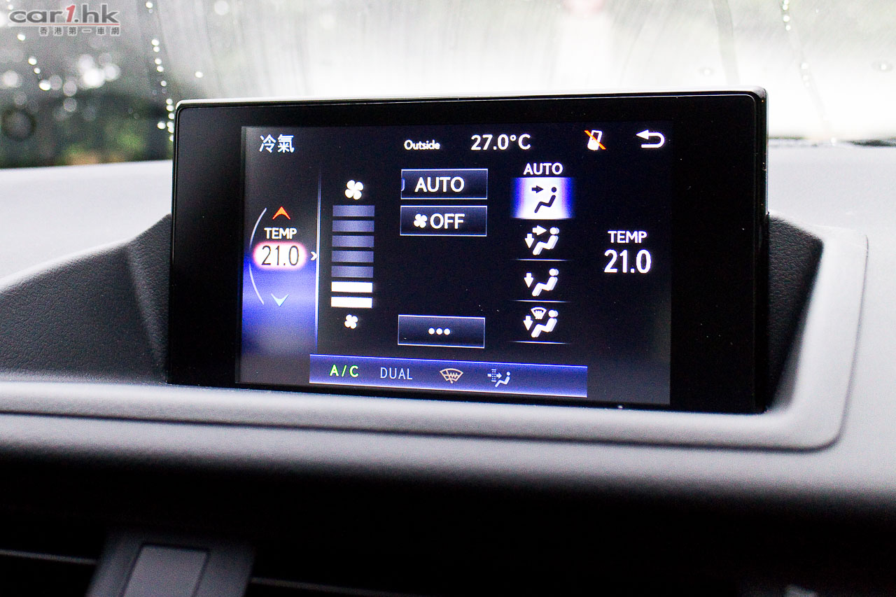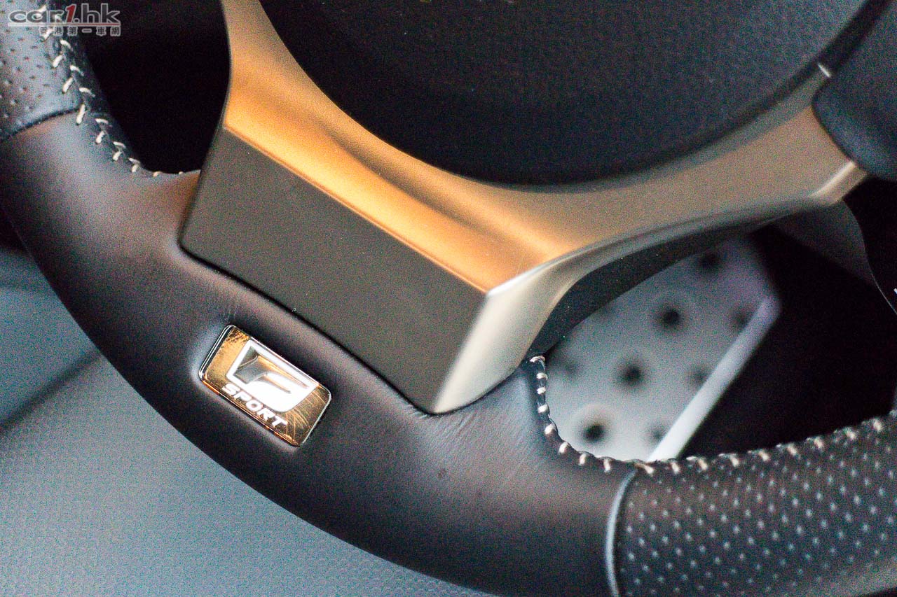 車廂佈局基本上跟普通版一致,中控台簡約整齊,上中下一層層,上方是 7 吋 LCD 顯示屏、中央是冷氣控制、下方是駕駛模式轉換。手枕前方就是中控台轉盤控制器,無需刻意摸索已經很快上手。軚盤貼上 F Sport 車章,同樣擁有多功能按鍵操作和定速系統,但是沒有轉檔撥片,有點美中不足。