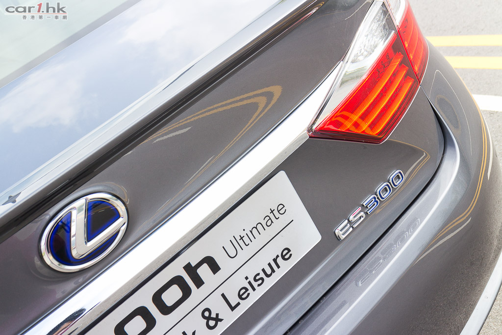 ES300h 配備家族式 Spindle Grill 鬼面罩及鐮刀型 LED 日間行車燈,外觀雖然看似與 ES250 沒有太大分別,但細看之下可發現改配了 17 吋多幅式合金輪圈,雙出排氣喉隱藏於尾擾流器,而尾車頂也加裝了小型鴨尾翼,整體外觀比 ES250 更具運動氣息和瀟灑。當然,藍色的廠徽及 Hybrid 標誌已是混能型號的必備設計。而車廂保留 Lexus 一貫的豪華風格,標準配備抱括了免匙系統、電動前座椅連冷風裝置及記憶功能、桃木紋軚環、電動天窗、三區自動恆溫冷氣附有納米離子空氣淨化、8 吋中央屏幕、Remote Touch 觸控儀、電動後窗太陽擋及泊車鏡頭。最重要是 ES300h 的長度達 4,900mm,使後座的腳部空間增加了 71mm,而頭部也增加了 19mm,後排空間相當充裕;另外,由於 ES300h 的電池組裝於尾部,所以尾箱空間只有 425 公升,不過已夠日常使用。