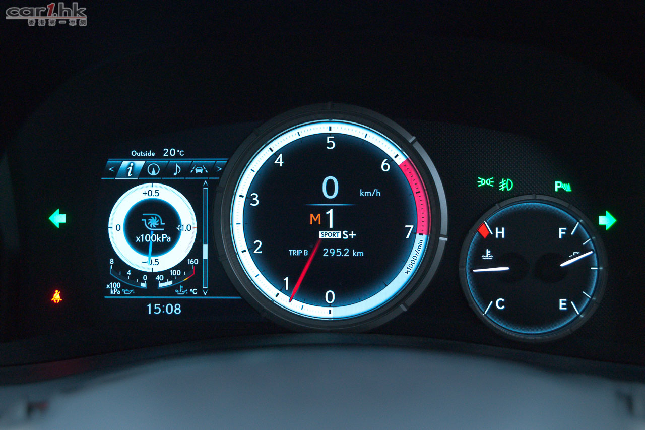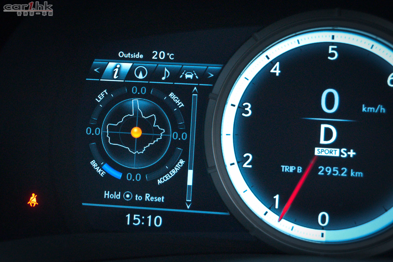 F-Sport 錶板的左方顯示屏新有 turbo/油壓/水溫錶、耗油量、指南針、Eco 慳油計、G-force 錶等,比 IS F-Sport 更多訊息。