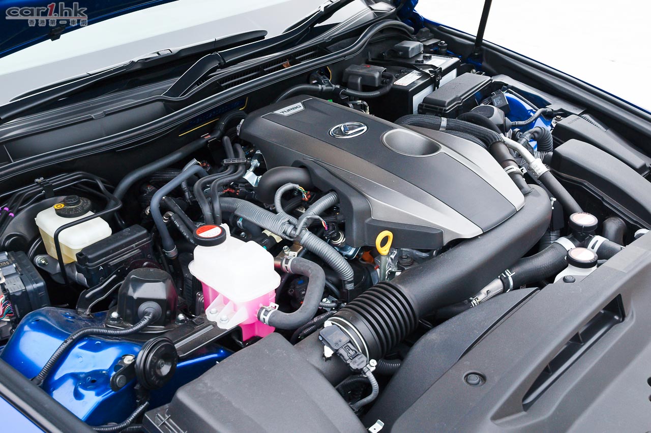 最新加入 IS 車系的,是這 IS 200t 型號,其「t」for turbo 渦輪增壓引擎,亦即 NX200t 和 RX200t 所用的同一台 2.0 升 4 汽缸「8AR-FTS」,最先由 NX 採用時,是 Lexus/Toyota 首台 2.0 升渦輪增壓引擎,設計重點有與寶馬一樣稱呼的「twin-scroll turbocharger」,在雙凸輪軸可變正時系統「Dual VVT-i」後加個「W」字的 Dual Variable Valve Timing-intelligent Wide(Dual VVT-iW),有特闊活瓣開合角度,Atkinson cycle,「D-4S」後加個「T」的直噴系統(D-4ST)是特為 turbo 引擎而設,廢氣 manifold 綜合有水箱水冷卻管道;引擎設計路向旨在優化燃燒效能,從低轉起有可觀的扭力輸出。引擎放在 NX 和 RX 時,轉數紅線是 5,800rpm,輸出有 238 匹 / 350 牛頓米,平均耗油量 NX 是 13.2 km/L,RX 要 8.3 km/L;6,200rpm 紅線的 IS 200t 則有 245 匹,350 牛頓米扭力一樣,平均耗油量 13.3km/L。