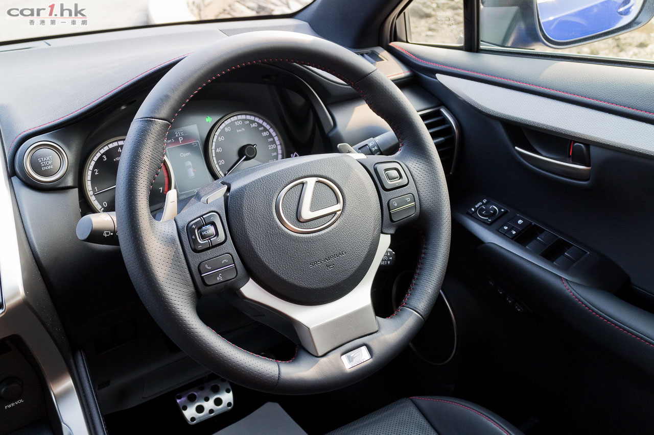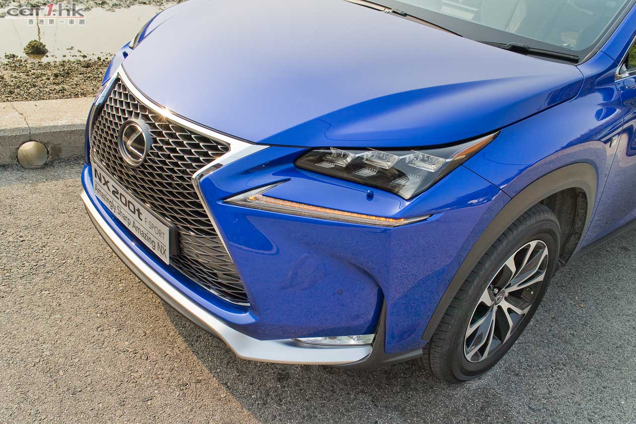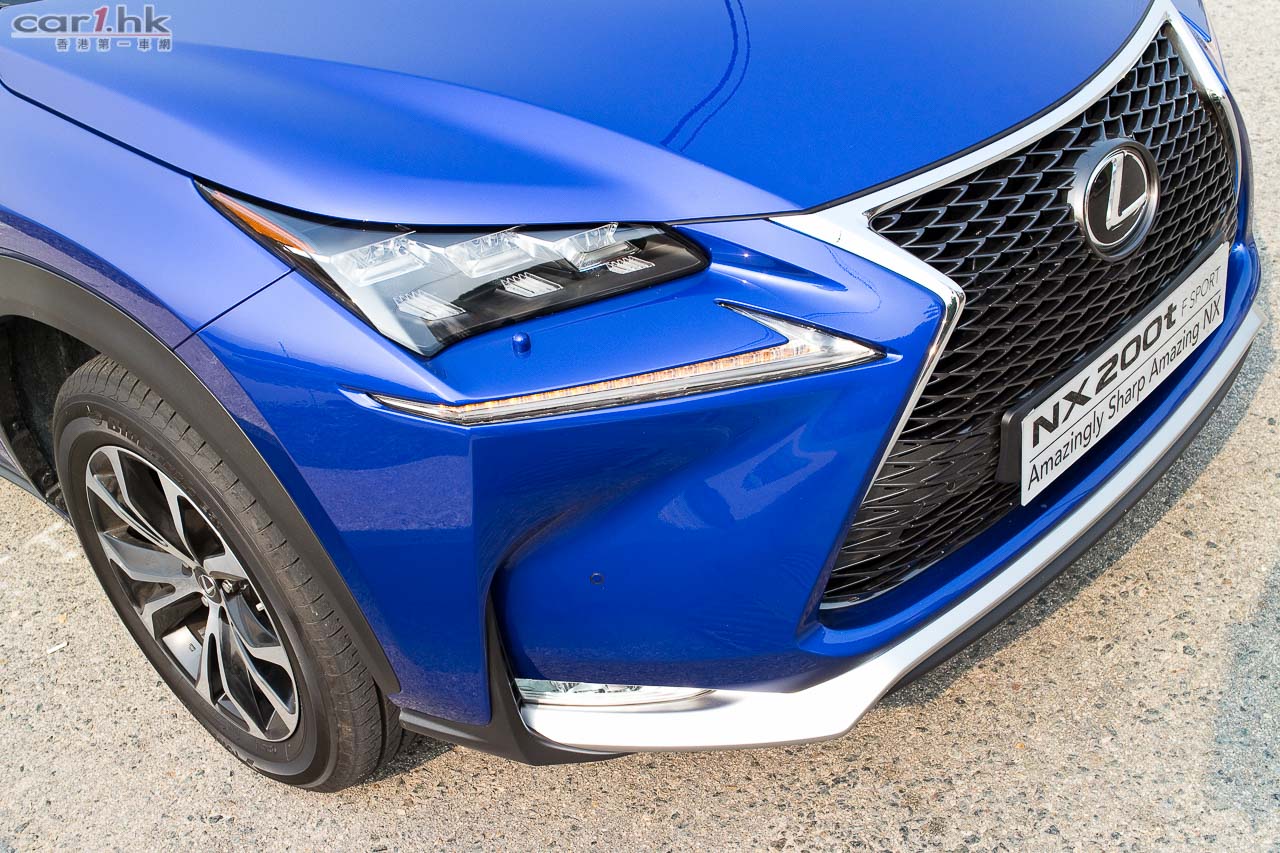 測試的NX 200t,乃Ultimate和Luxury以外的F Sport版本,售價43至52萬元。車子「F Sport」化的地方,有銀/黑色下唇的頭泵把、「攣毛」狀的鬼面罩、前沙板「F Sport」logos、18吋F Sport輪圈、黑殼/銀邊的門邊睹後鏡、兩個梯形死氣喉咀;車內改用F Sport軚盤、鋁腳踏、紅/黑色F Sport前座、有紅色縫線的黑色皮革、F Sport儀錶特有G-force meter和turbo壓力錶;底盤也有其「F Sport」化之處,就是採用較硬的performance dampers吸震筒,前支柱式/後雙搖臂懸掛經同一班調校LFA的engineers調校過。