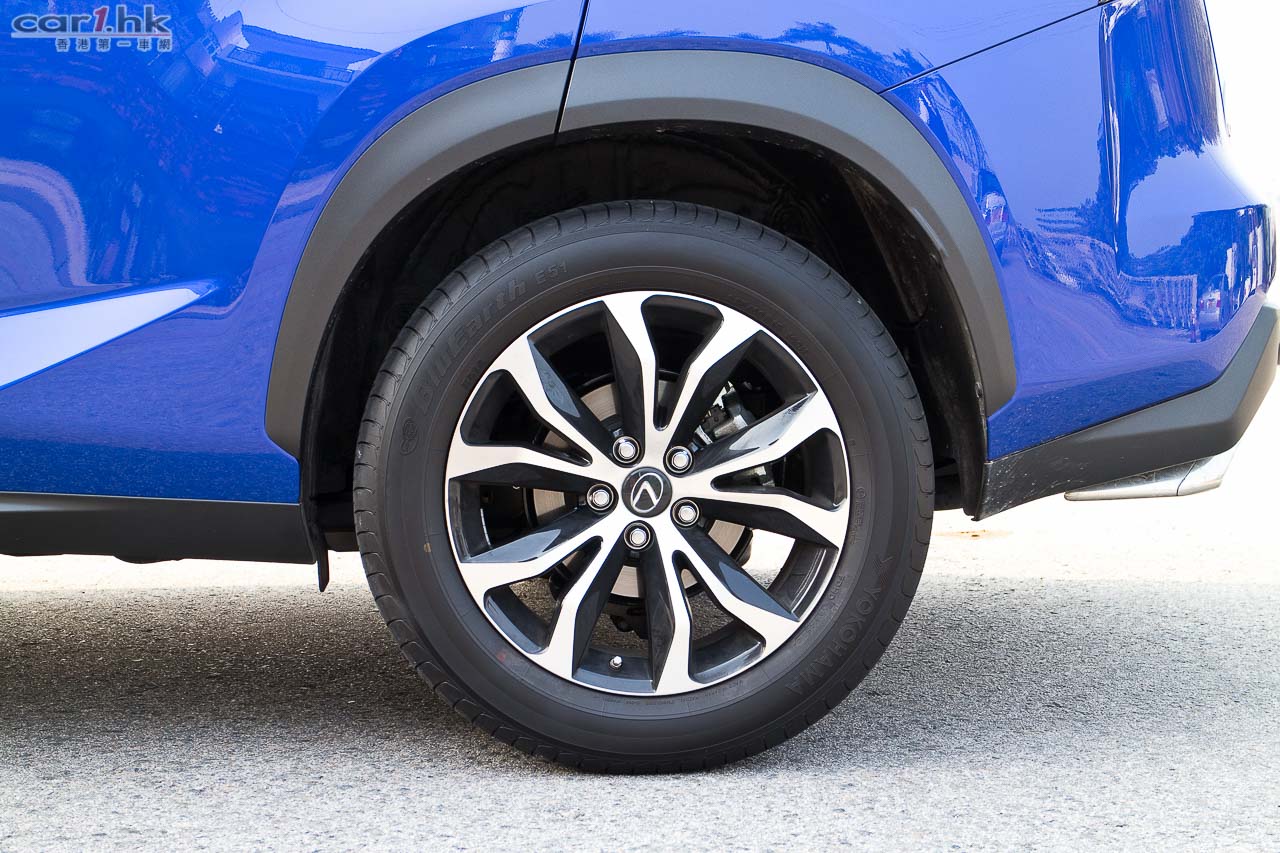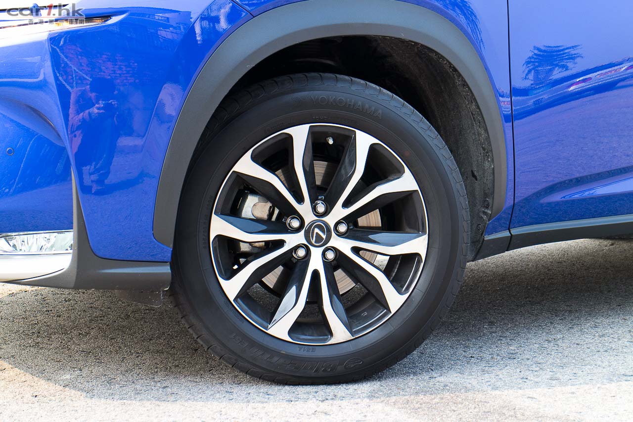 18吋F Sport輪圈;底盤「F Sport」化之處,是採用較硬的performance dampers吸震筒、前支柱式/後雙搖臂懸掛經同日班調校LFA的engineers調校過,車子明顯較NX 300h少浮沈,較少傾側,轉向和拐彎反應較快。