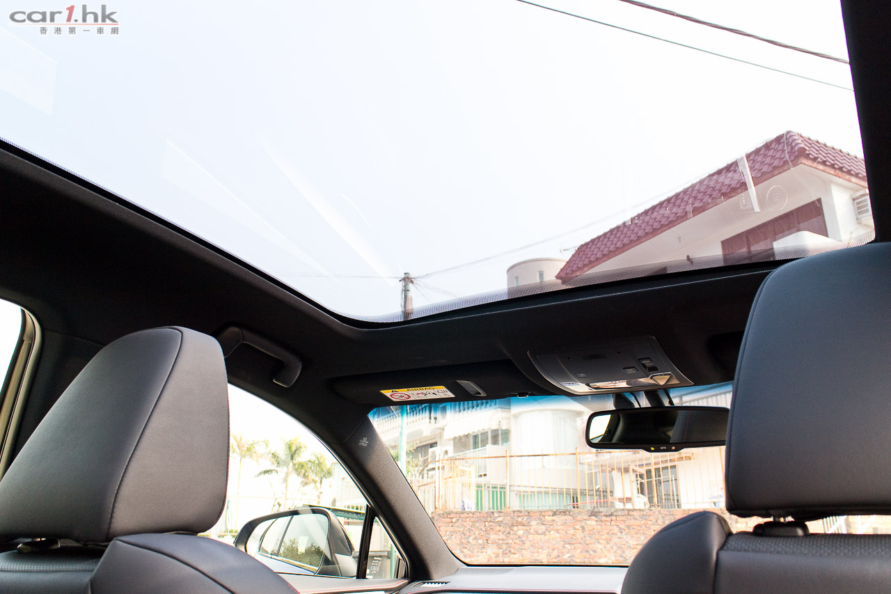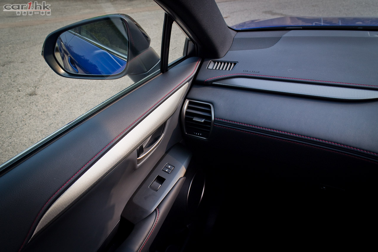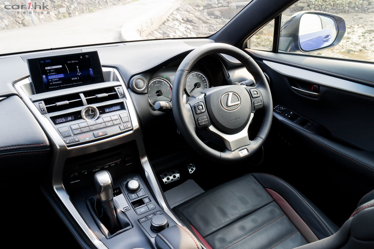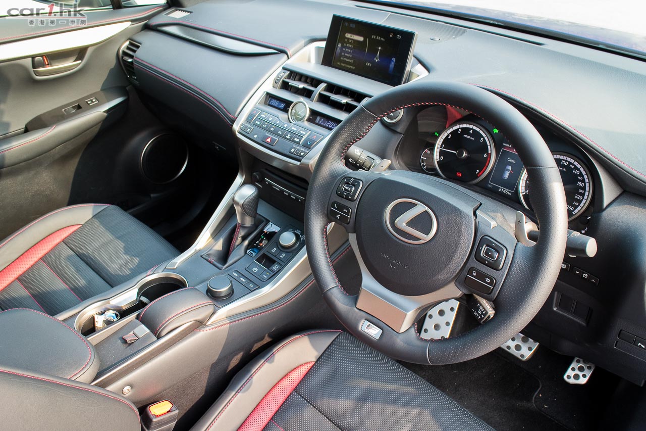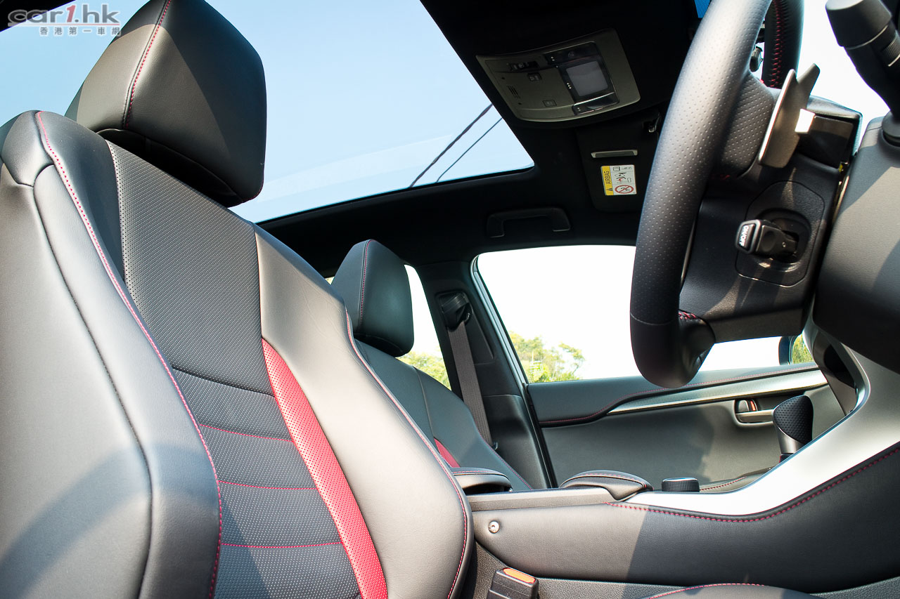 車內改用F Sport軚盤、鋁腳踏、紅/黑色F Sport前座、有紅色縫線的黑色皮革;panoramic天窗與NX 300h的一樣。