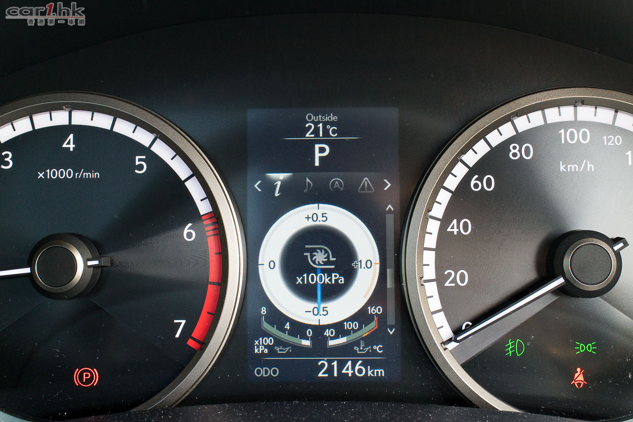 F Sport錶板另有turbo壓力錶;與寶馬一樣稱呼的「twin-scroll turbocharger」,確實由低轉起已有谷著上路的扭力反應,也沒有feel得到的turbo lag。