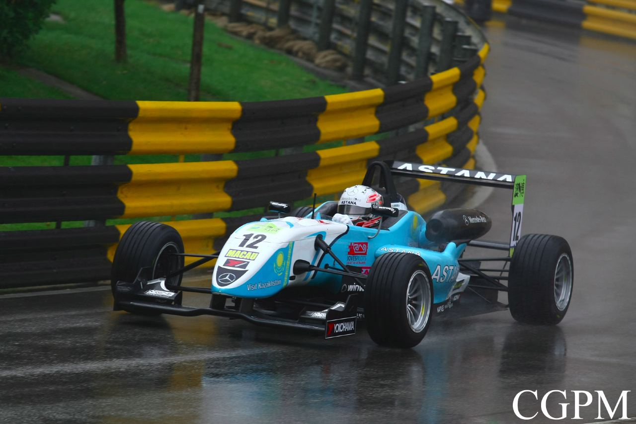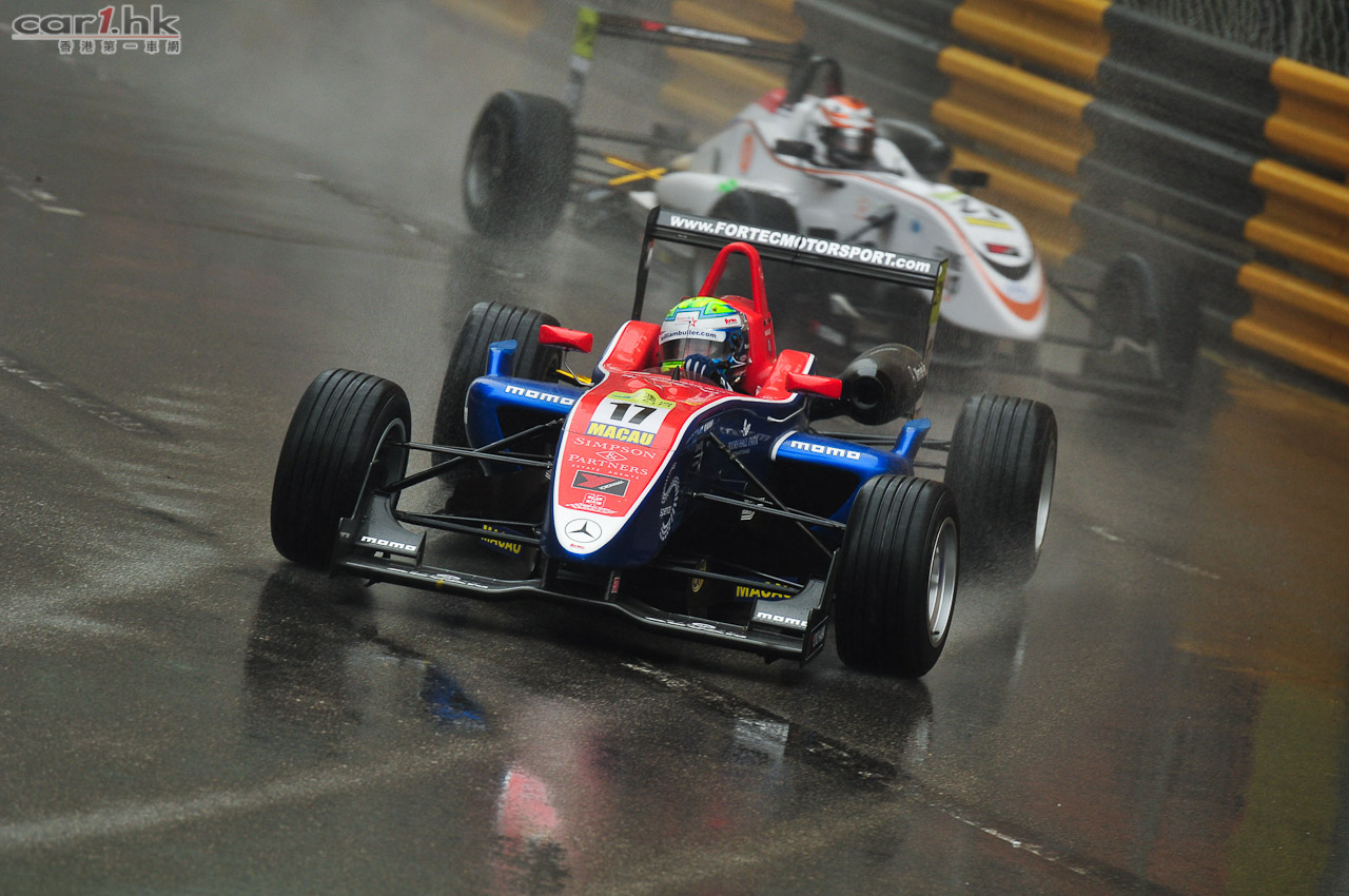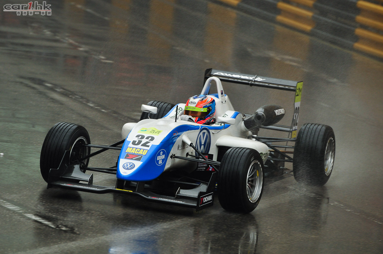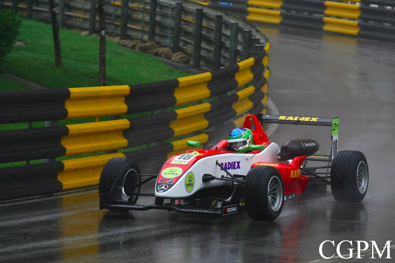 馬里(Roberto Merhi)星期四在濕滑的東望洋賽道上脫穎而出,暫時取得「澳博」澳門格蘭披治三級方程式大賽的杆位。不過,馬里後來和另一輛戰車相撞,他被迫提早結束排位賽。30 分鐘的第一節排位賽在雨下展開,車手把握時機,在賽道情況未轉壞前努力造出最快時間。