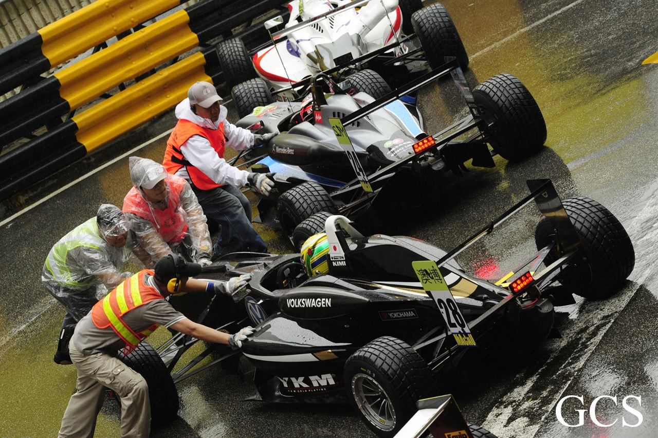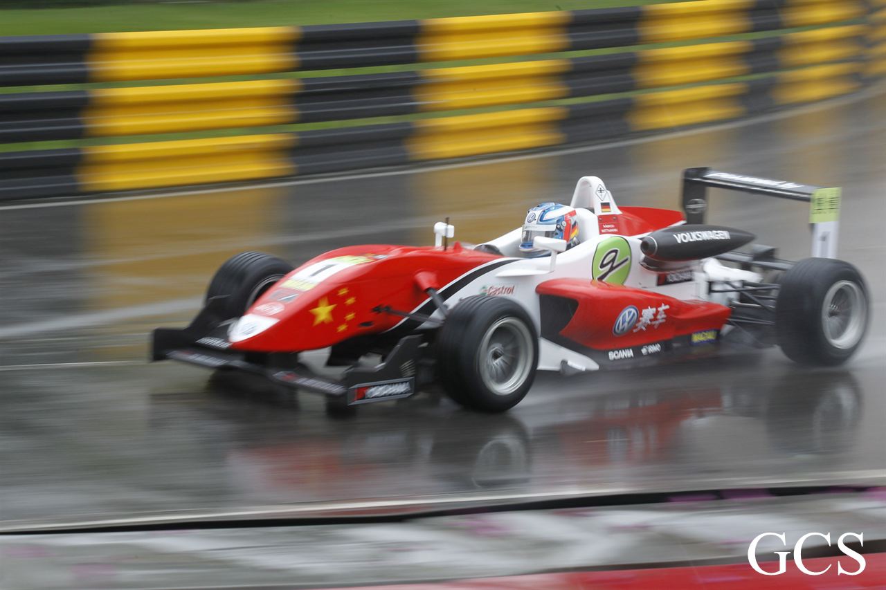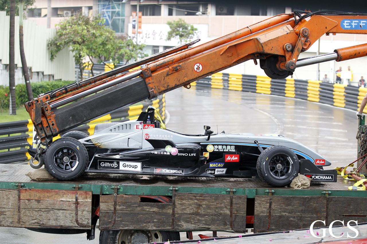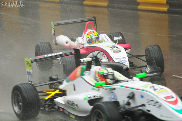 馬里(Roberto Merhi)星期四在濕滑的東望洋賽道上脫穎而出,暫時取得「澳博」澳門格蘭披治三級方程式大賽的杆位。不過,馬里後來和另一輛戰車相撞,他被迫提早結束排位賽。30 分鐘的第一節排位賽在雨下展開,車手把握時機,在賽道情況未轉壞前努力造出最快時間。
