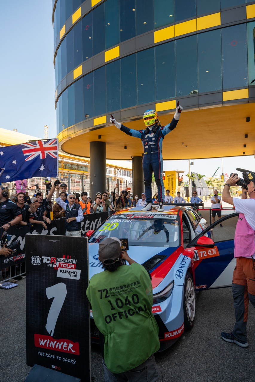 畢勤(Josh Buchan)在東望洋跑道上力抗 Lynk & Co 的猛烈攻勢,最終以一場近乎零瑕疵的演出奪得澳門東望洋大賽 – Kumho 國際汽聯 TCR 世界巡迴賽澳門站第二回合冠軍,並成為史上首位在這項殿堂級街賽登頂的澳洲車手,寫下重要一頁。