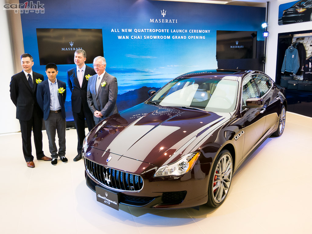 全新第六代瑪莎拉蒂Quattroporte新車發布會於擴充營業的灣仔瑪莎拉蒂陳列室盛大舉行,並由快意汽車有限公司執行副主席夏德成先生、董事長約翰尼曼先生、瑪莎拉蒂大中華區市場部經理孫啟瑋先生與及瑪莎拉蒂品牌總經理莫志偉先生主持剪綵及新車的發佈儀式,不僅宣告著全新第六代瑪莎拉蒂Quattroporte正式登陸香港市場,同時標誌著瑪莎拉蒂品牌進入一個全新時代。