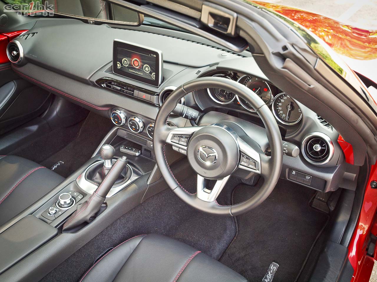 MX-5 迷不會感到陌生的車廂,氣氛和用料和以往相似。乘客坐點比舊款低 20mm,坐姿更是低長之外,舊款稍稍偏左的右腳腳踏位置,現移至與司機成一直線,不再要用體位張就;軚盤同樣平直。緊密的空間,坐至座位最後一格的我,腿位緊緊夠用。座椅的弧度與前相似,腰和髀墊不算夾身。波棍台現有鍵盤,控制豎立在中控台上的 tablet 形多媒體顯示屏,屏幕雖不阻視野,但一塊的棟著,卻有點阻眼。門壁板的上截與好些「性格」車一樣,玩與車身同色,即將室外帶入室內的 gimmick。頸後的防滾架同樣是亮麗黑色;之間的擋風板也是網形黑膠。MX-5 馳名的易用手動軟篷,新車沒有兩樣,一個「T」柄,解扣… 一扭… 便可將軟篷推開,坐著也可自己搞掂,無需女伴幫手,摺起的軟篷平齊的收納在背後。