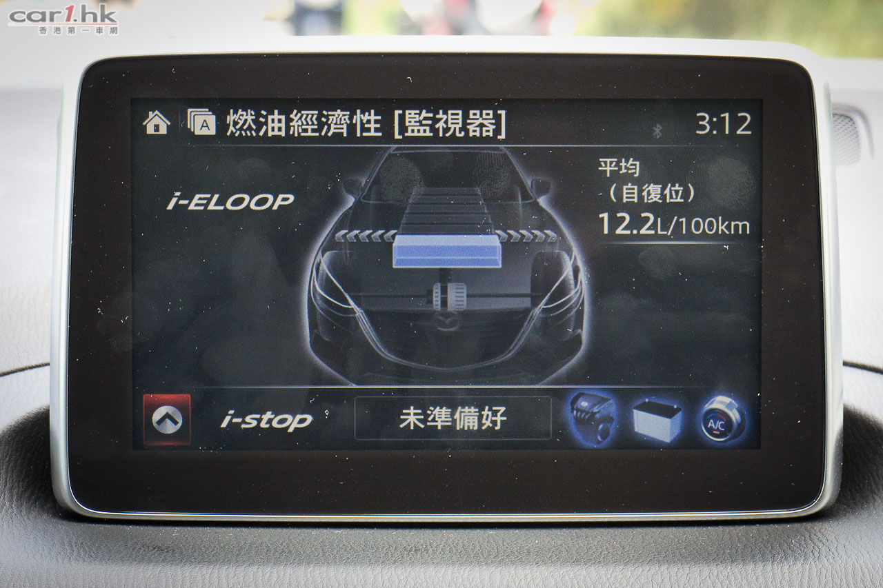 另一個重點設備就是 Human Machine Interface 多媒體中控台,而這套系統基本上可以跟歐洲車看齊,其圖像化介面簡單易明,波棍下方亦有快捷鍵和轉盤,操作無難度。內置 i-ELOOP 制動力回收系統的 Mazda3 五門揭背版,其運作可以在中控台上的 7” 屏幕上看到運作狀態,其實對實際使用沒有太幫助,不過對駕駛者來說是可以更了解汽車當時運作,當然還會多一份 Hi-Tech 感,玩新車都是想多一點這份感覺吧。