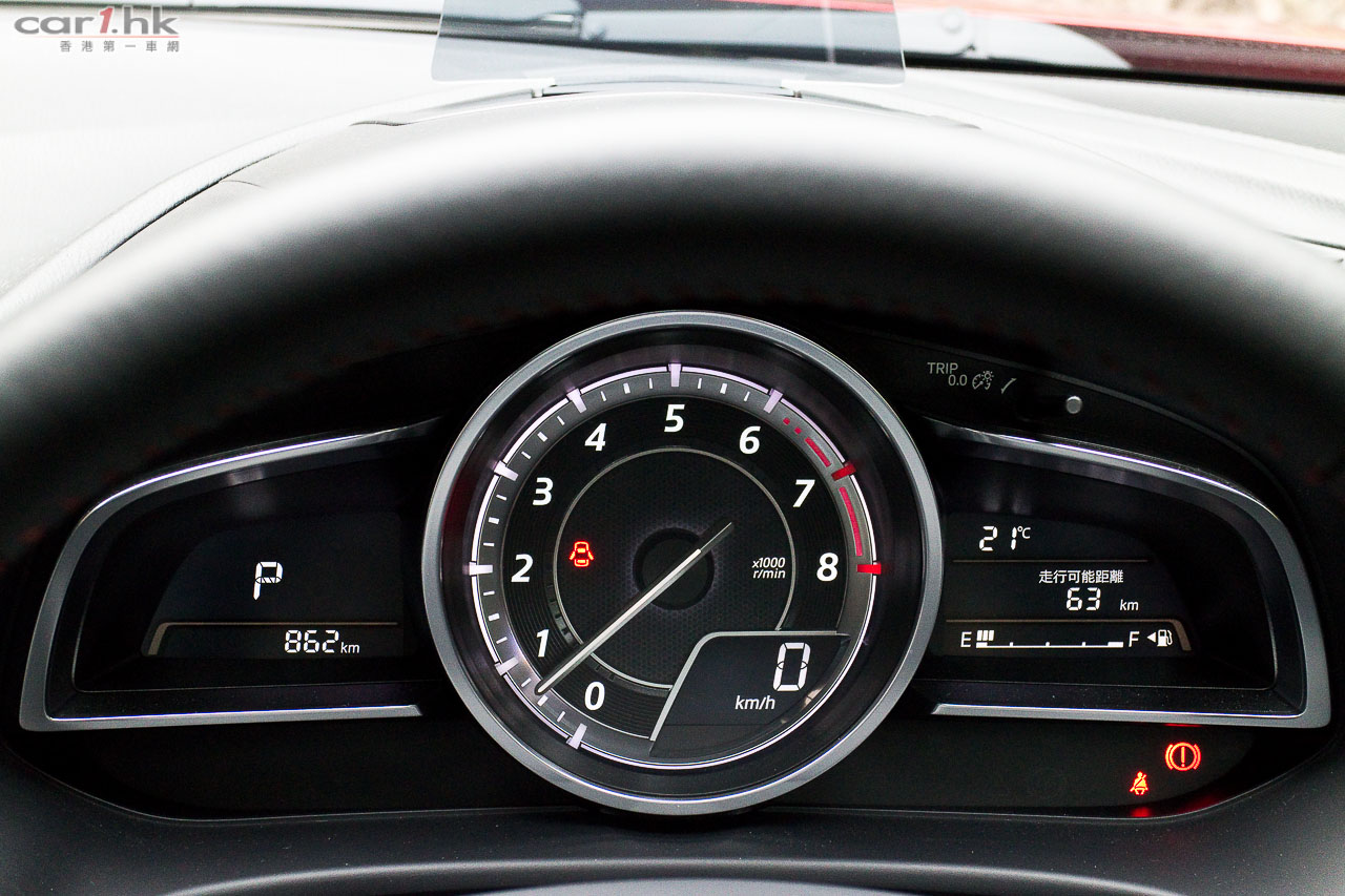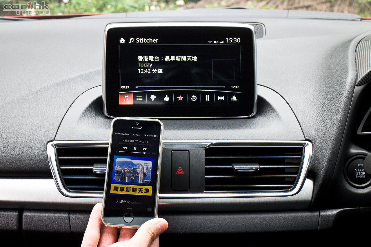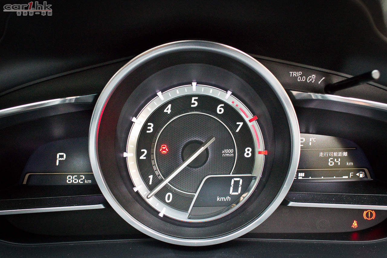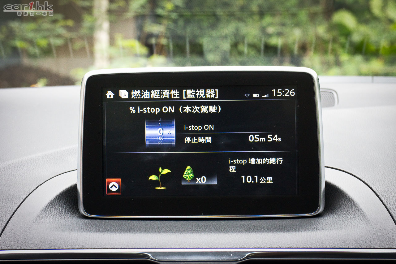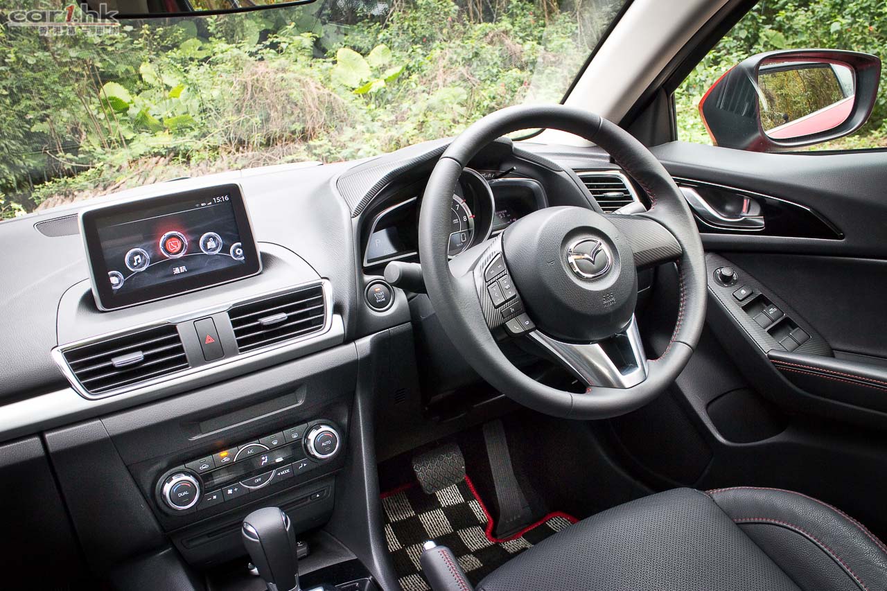 Mazda3 的 HMI 在波棍後設有轉盤形的滑鼠,不能降低的屏幕內,介面裡除了有例如音響、保養事項、藍牙電話、一般車輛設定外,更有符合環保大前題的 i-ELOOP 再生能源系統的充電狀況、稱為 i-DM (Intelligent Drive Master)的耗油量顯示兼慳油指引,接連 Aha by HARMAN 網絡平台的話可上 Facebook 和 Twitter,有衛星導航系統的話屏幕可顯示地圖和引路指示。試後我們覺得萬事得 HMI 系統的旋轉滑鼠手感幾好,每格都有 click click click 的觸感,屏幕顯示頗美觀,但這些慳了多少電油就送你一棵樹的東西則有點傻氣。HID 投射儀錶在儀錶盒上有一塊長方形透明膠片,顯示單一的車速,沒有轉數錶,如有導航系統的話會有帶路箭咀,投射高低可由 HMI 滑鼠經屏幕控制;但我們覺得這膠片除塑膠了點外,從撻車開始便一直豎著,不能縮低,嫌它阻礙視線便沒有法子了。