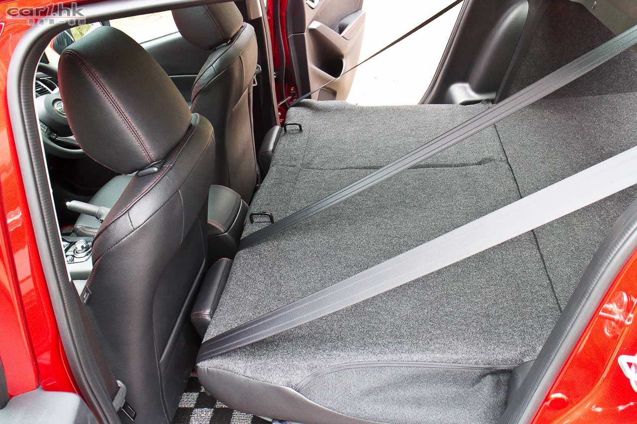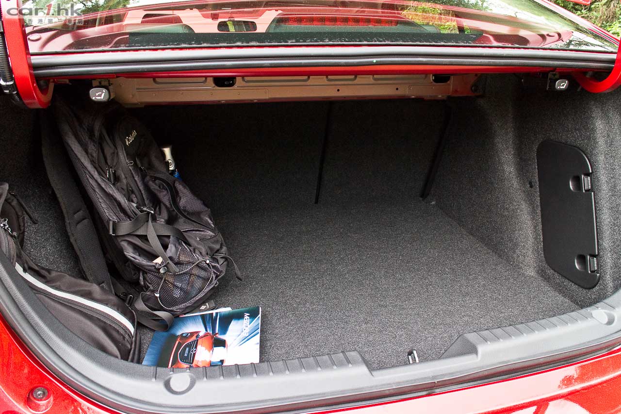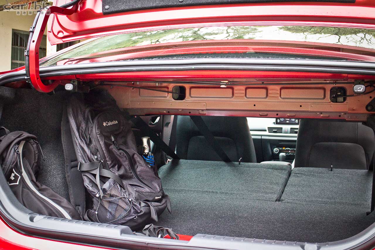以初級房車而言,Mazda3 不錯的行李箱容量,行李箱內設有手抽,方便將 60/40 的後座椅背彈低。