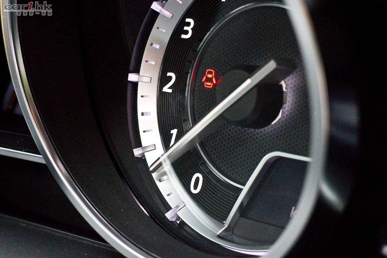 會展模樣的儀錶盒內,以銀邊包圍著眼睛形狀的儀錶,正中圓形的是轉數錶和跳字式車速顯示。