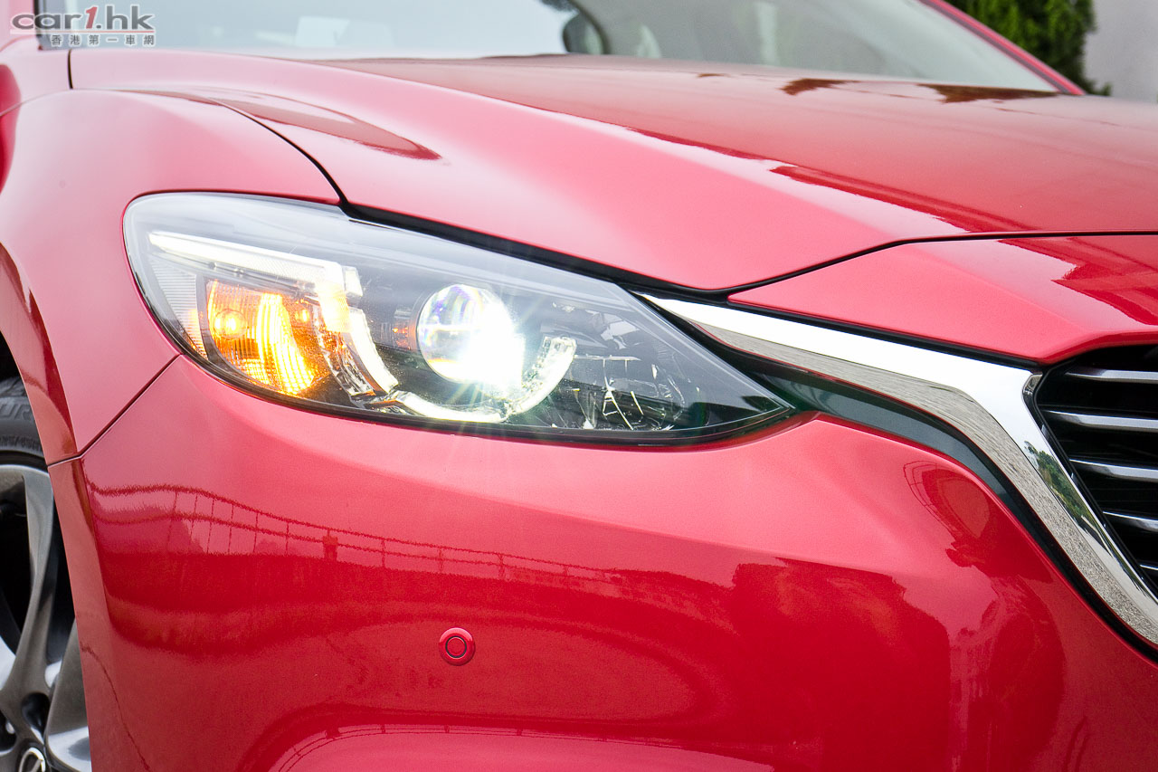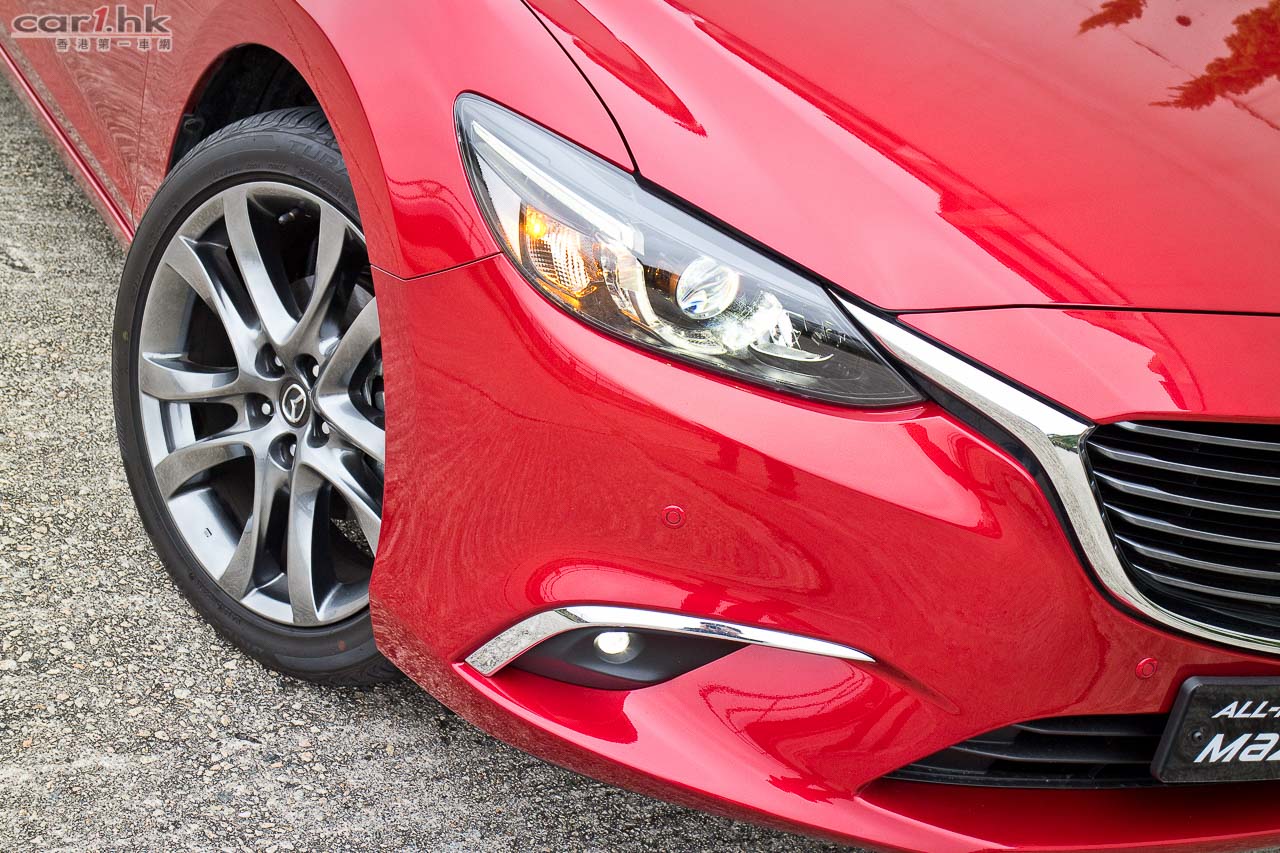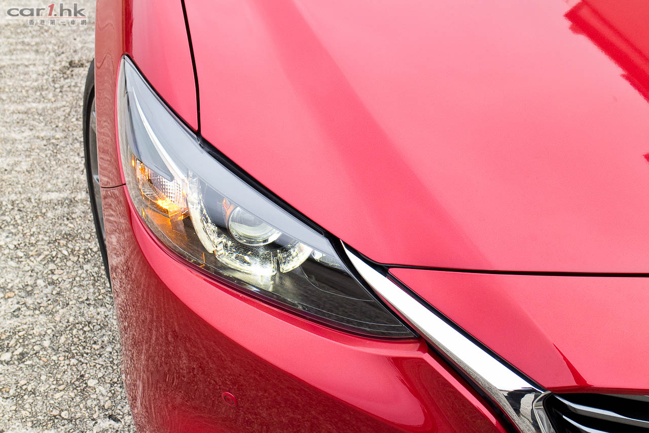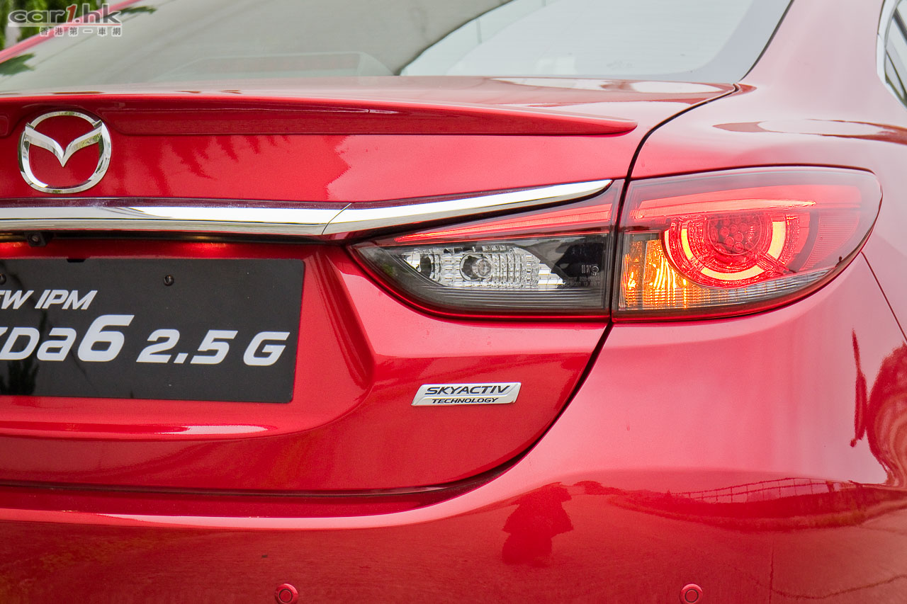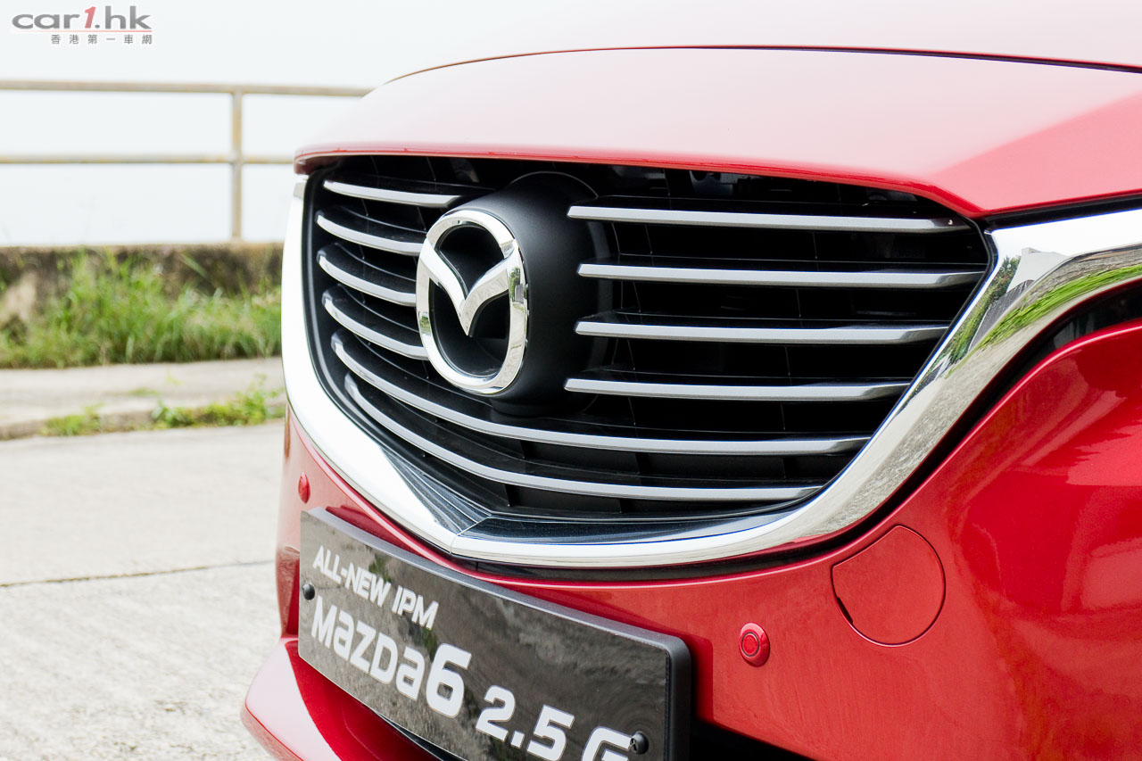 今代 Mazda6 由 2012 年開始供應市場,轉眼間已用了數年,在中型房車戰爭激烈的情況下,今次試駕的 Mazda6 2.5 IPM 雖然不算全新改款換代,但廠方依然要給大家更多新鮮感。車型設計大至上沒有轉變,不過在家族式大口仔鬼面罩開始,已經變得更厚更有層次更立體,其「飛翼型」電鍍邊亦有加粗,將輪廓突顯出來。車頭燈、車尾燈亦用上近年 Mazda 新車系的車燈設計,大量加入 LED 作照明,亦應用了跟 Mazda2、Mazda3 一樣的新一代「小眼袋」車燈設計,如果單講外型的話,絕對比另外幾個日系中型房車新潮。霧燈設計方面,使用全新 LED 霧燈,可見廠方想盡方法令這部車更環保。在車身的骨線、車頭的設計型態,「魂動」(KODO-Soul of Motion)概念風格仍是外型設計的主要骨幹,在街上行走的話,一眼就知道它是 Mazda 新車。輪圈換上了轉深炭灰色高光塗層的 19 吋鋁合金輪圈,是否太大見仁見智,不過套用在 Mazda6 的車身有助提升它的觀感,試駕時亦未有感到彈跳過多問題。