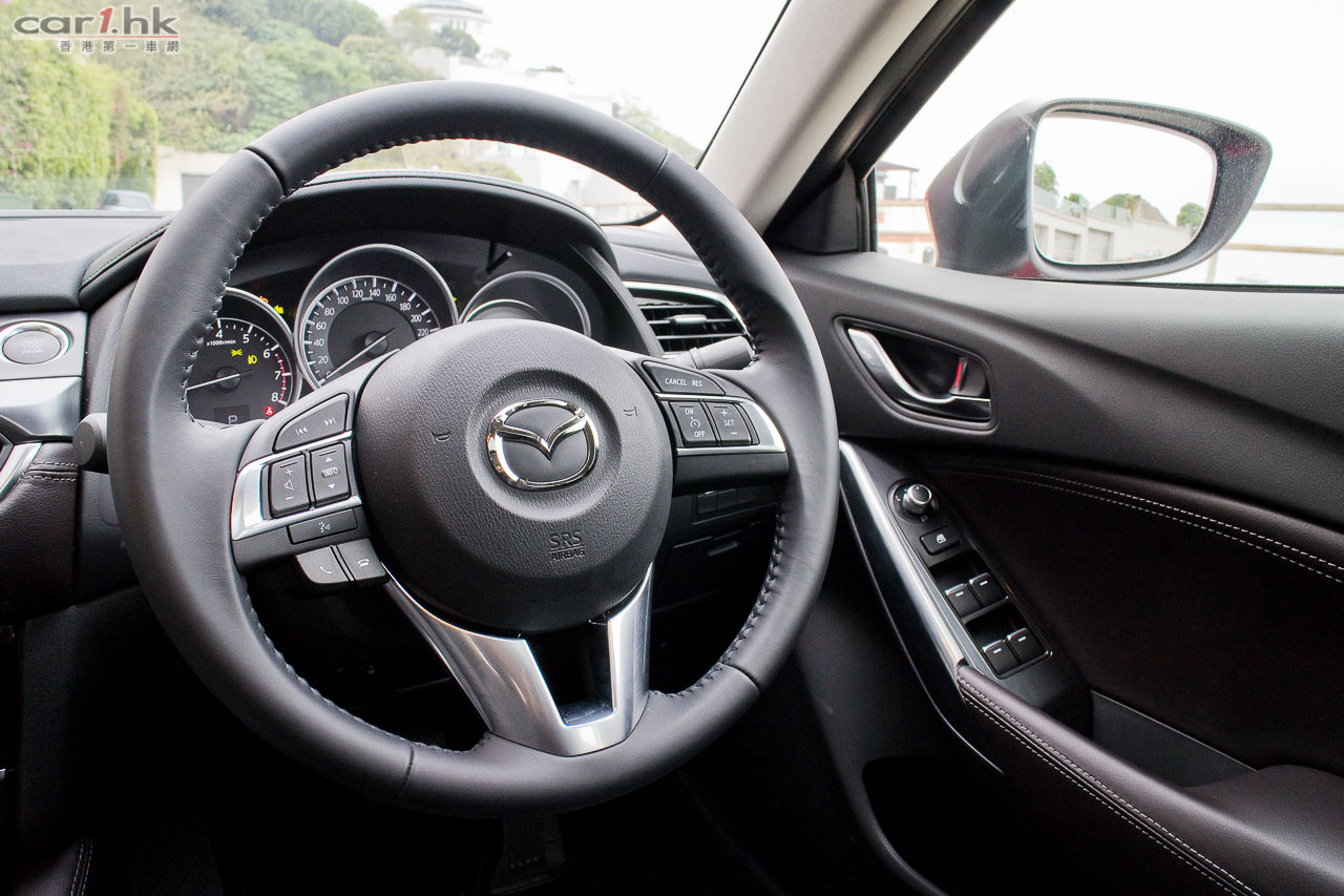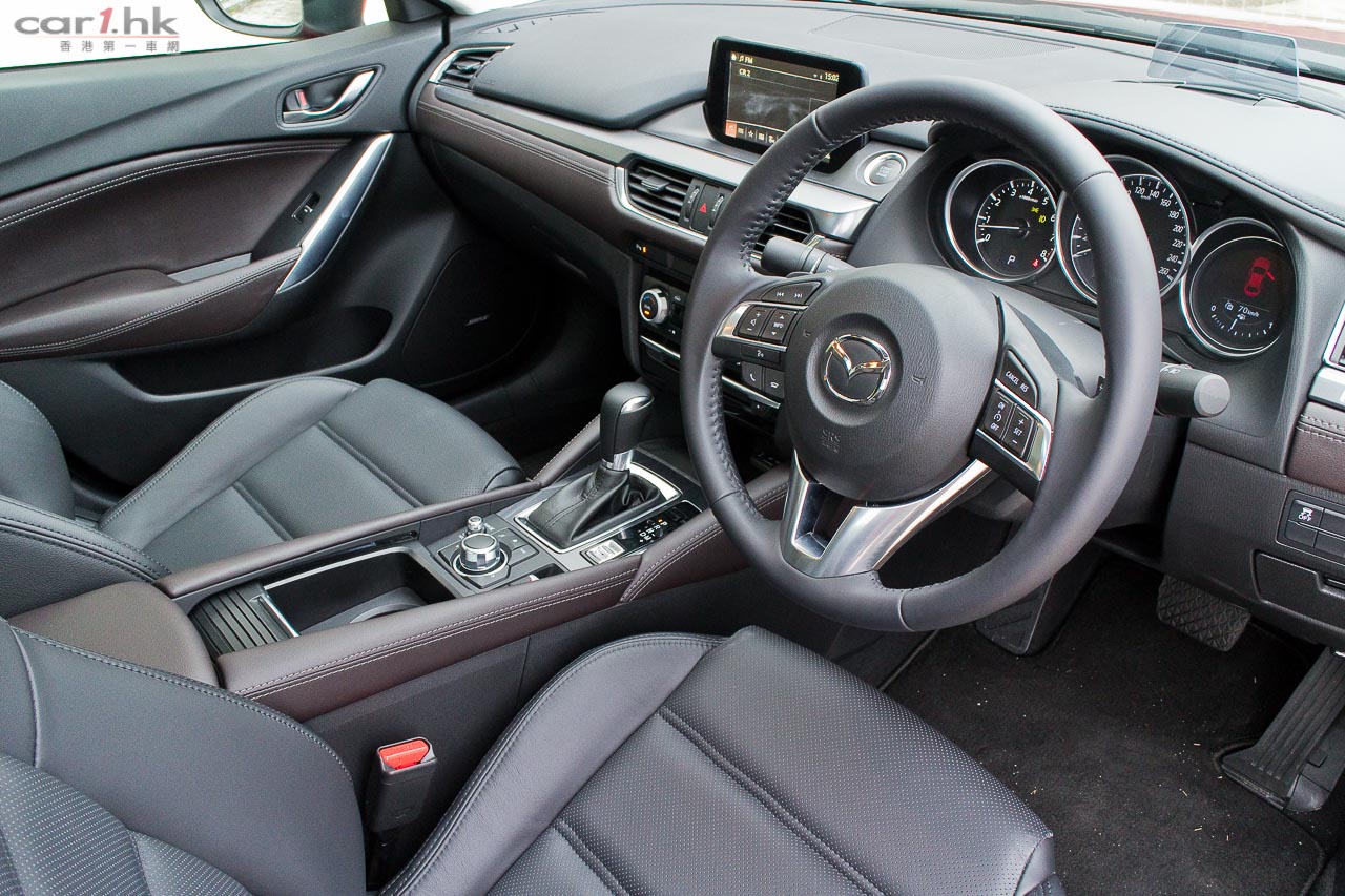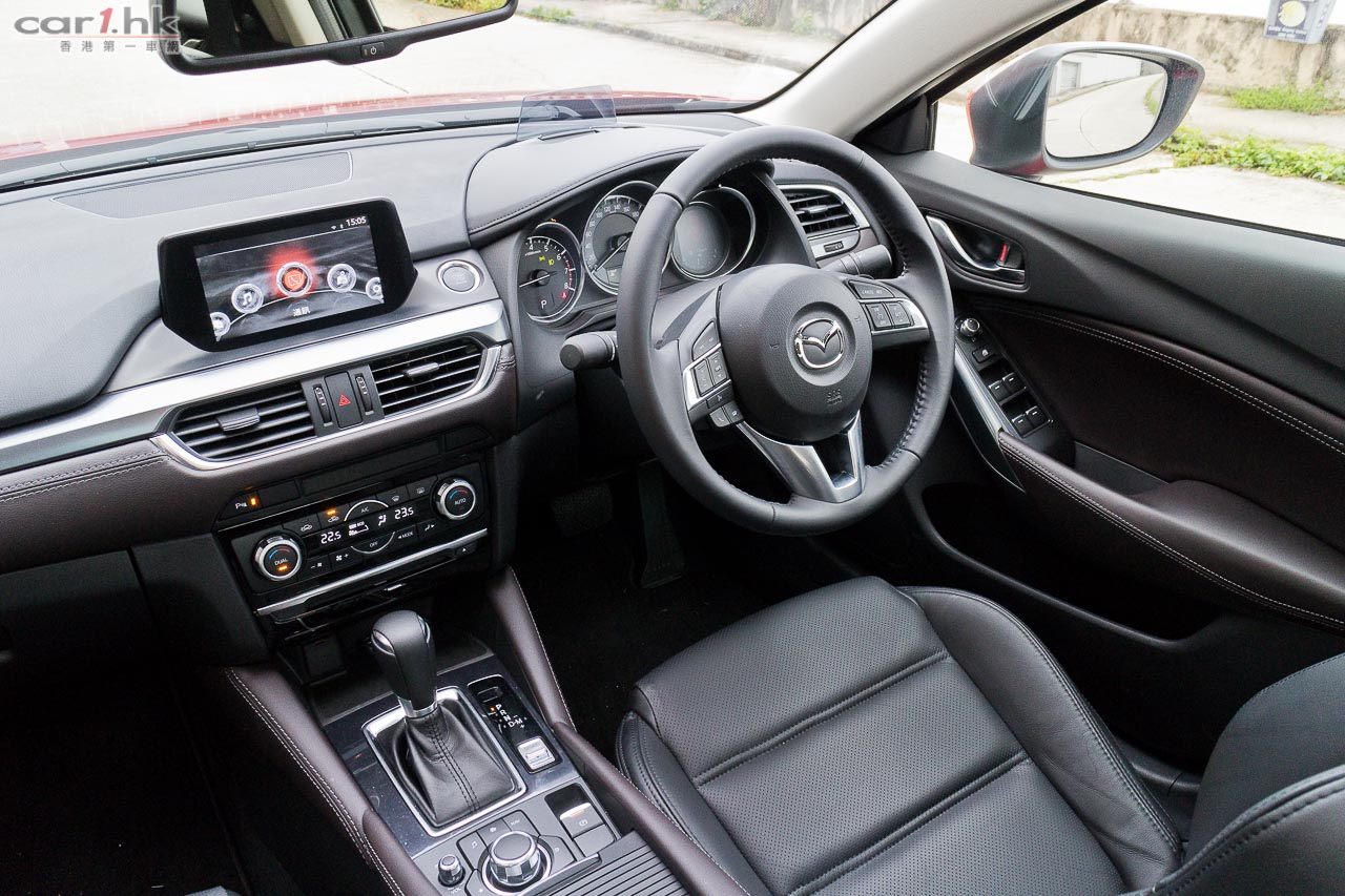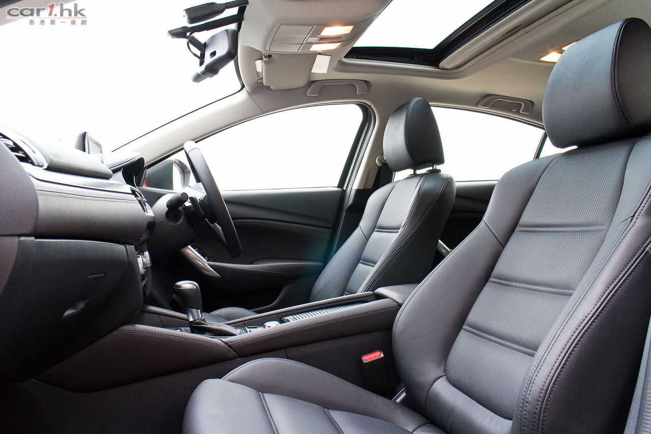 由於車架底盤未有作出改動,車廂內的空間感跟過往 Mazda6 版本是沒有分別。要令駕駛者和乘客感到不同,就要在用料、配置上著手了。跟過往 Mazda6 相比,今代是豪華了,用料細緻了。全車皮座椅外,儀錶台、裝飾面板、後控制台和門邊手枕等,均採用雙線縫製皮革裝飾,豪華感直線上升。中控台上的 7 吋正是最新 Mazda Connect 系統,操控跟 Mazda3 一樣,轉盤加快捷鍵(官方名稱:HMI多媒體操控鍵),使用來起來簡單易明。過往令到駕駛席不名美觀的機械式手掣拉桿,今次終於由電子泊車手掣取代,在進入 D 波進油時,電子泊車手掣就會自動鬆開,令駕駛時便捷得多。新增電子泊車手掣外,還有 SPORT 模式按鍵,可以在普通和運動模式之間設換,迎合不同駕駛環境需要。進入這部 Mazda6 IPM 後,就覺得它是 Mazda3 的延續,的確給人耳目一新,當中駕駛席的 Head-up display 車速顯示器亦是由 Mazda3 帶過來。其實 Mazda 是一個很特別的車廠,歐洲大廠都是將最新最好的設備先放在頂級車,往後日子才慢慢下放到較低級車系,而 Mazda 偏偏在 Mazda3 入門房車放盡所有設備,再慢慢伸展到其他車系(如 Mazda2 和今次的 Mazda6),是比較特別的手法。Mazda6 前座椅背再沒有使用傳統 S 彈簧,改用 Pullmaflex 背墊,僅令椅背更貼身,亦可增強對背部的承托力。座墊則採用高吸震力聚氨酯物料,亦有助緩減震盪。後座座墊亦採用與前座相同的高吸震力聚氨酯物料,可有效緩減行駛粗糙路面時所產生的震盪,例如鋪裝欠佳的瀝青路面等,減少傳送至乘客的震盪。中型房車隔音性往往被車主看重,Mazda6 在這方面大力著手,大量採用吸收噪音的物料,亦增加了密封位置,擴大車身側樑下的擋石板和車底護板,以提升座艙的寧靜感,實際試駕時除非有大型車輛或巴士駛過走近,才聽到明顯外來嘈音,一般行車時,車廂內算很寧靜。而在起步或上斜時引擎高轉發出的聲響仍會聽到,這亦在所難免,現有的隔音狀況和這個級數的中型房車來說,算是不錯。