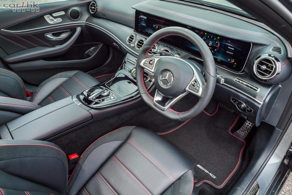 E 43 一如我們試過的 AMG 版 C-Class、GLC 和 SLC 的「43」一樣,是真正 AMG「63」以下較緩慢、較小辣也較便宜的初階 AMG 汽車,車身 AMG 化的地方大至與普通 E-Class 可加錢另購的 AMG-Line 部件一樣,與(原廠已推出的)E 63 的設計不同,E 43 有較大左、中、右三個入風口的前泵把,左、右方有兩條像貓鬚的橫間,亮麗黑色「鑽石」形鬼面罩有一點點電鍍粒粒和「AMG」標誌,沙板 Logo 寫著「V6 BITURBO」,車尾有與車身同色的小尾翼,有 Diffuser 的尾泵把有銀色飾塊,一對雙電鍍排氣喉咀,19 吋 5 柱 AMG 款輪圈,引擎蓋沒有「真 AMG」「一人一引擎」(One man, one engine)的洋人技師簽名牌而有紅色「V」形盾牌。車廂裡,有「D」形軚盤、紅色安全帶、鋁腳踏、黑色天花、啞深灰色錶板飾塊,Sports 版前座以 Artico 人造皮和 Dinamica 仿猄皮包裹,有加厚的側墊和不同的縫線圖案;我們最有興趣知道AMG車必有的「格仔旗」儀錶圖案,全以 TFT 顯示的 E-Class 怎樣表達…原來是在各個主題的圓錶內以漸變帶出;不知怎的,老是覺得像家庭影院的 E-Class 車廂,氣氛偏向豪華,即使座椅、門壁、軚盤、錶板台等地方縫上長度大概可圍繞地球一周的紅線也不覺太跑格。