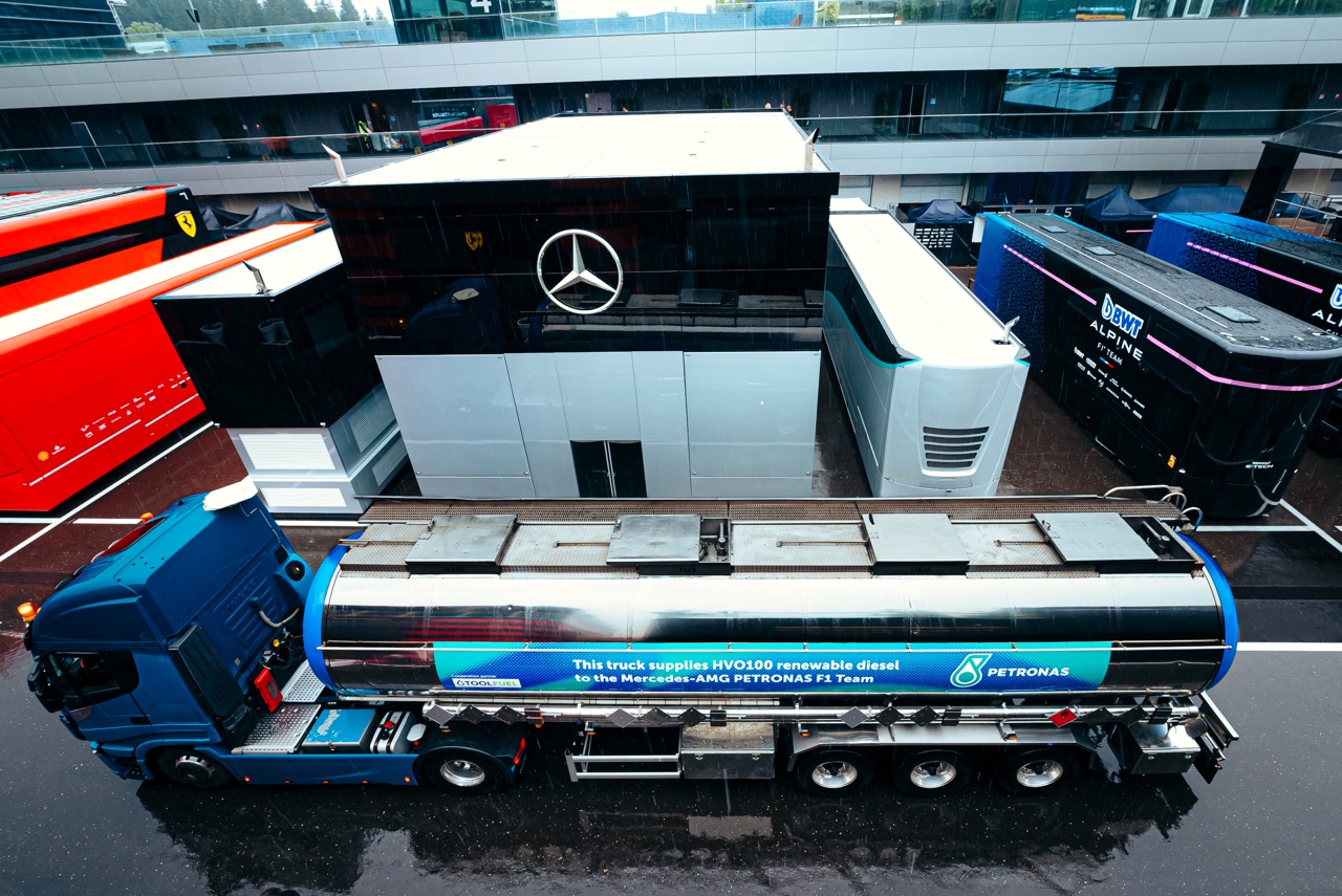 Mercedes-AMG PETRONAS F1 車隊與冠名贊助夥伴 PETRONAS 及物流合作夥伴共同努力,在 2023 年度一級方程式歐洲賽季中,通過使用HVO100 生物燃料,節省了339 公噸二氧化碳當量,並將賽車和卡車以及引擊的排放量減少了67%。