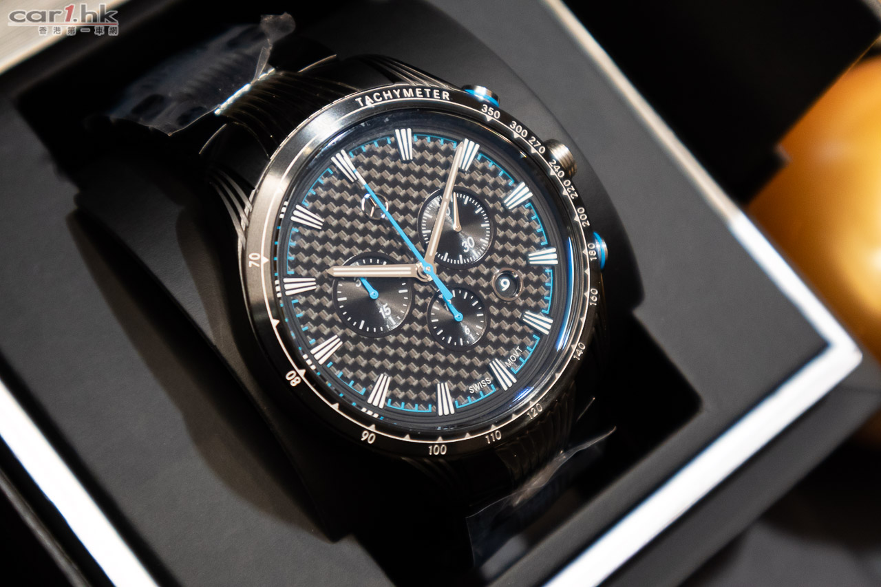 男士 Motorsport 計時腕錶,使用瑞士 Ronda 5030 石英計時機機芯,不銹鋼/碳纖維作錶身物料,直徑約 45mm,防水效能達 10 ATM 大氣壓力標準。原價:$3,840 特價:$3,072