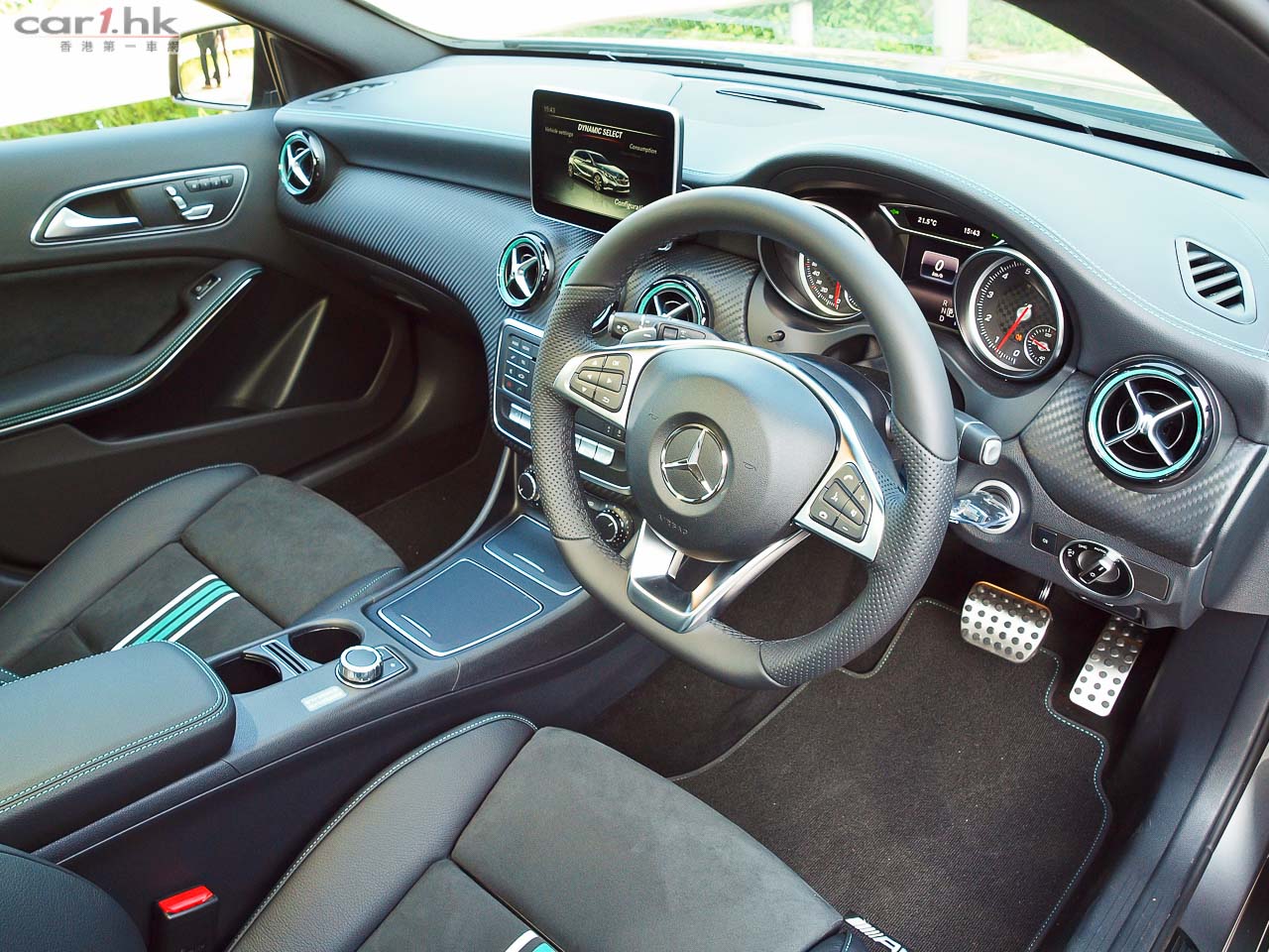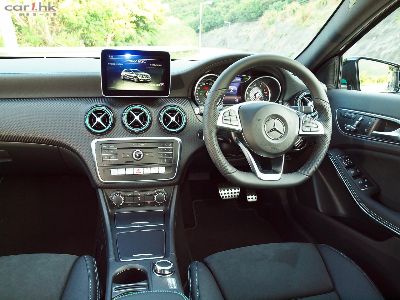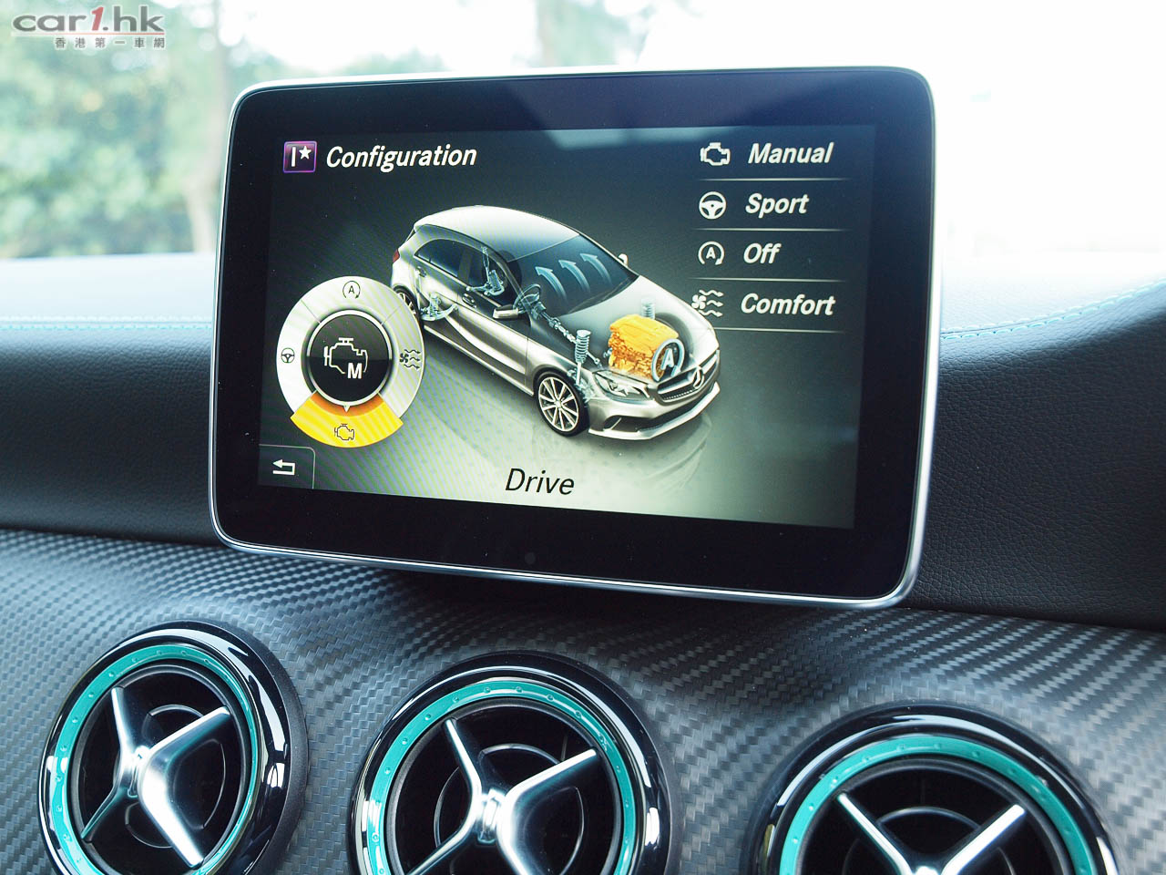 之前的 A-Class 只有 DCT 雙自動離合器波箱可揀 E、S 和 M 手動轉波模式玩,現新設 Dynamic Select 系統,駕駛起來忙碌得多,可選引擎/傳動快慢、軚盤輕重和空調輸出的「Comfort」、「Sport」或「Eco」設定,系統同樣有「Individual」模式可各項自定,如重軚盤配柔順轉波之類,車系另可選配 adaptive damping 電子吸震器,再可揀懸掛軟硬。沒有電子吸震器的示範車,可能因為用上 19 吋 AMG 輪圈的關係,行駛感覺比用18吋輪圈時稍為硬化,舒適和吸震效果下降,但操控反應和清晰感覺上升,掟彎時,響胎速度頗遲出現。7 前速 DCT 自動離合器波箱,轉波反應是只見轉數錶指針續個波「跌…跌…跌…」的爽快,拖波識補油,但手動模式下會自動於紅線轉波,所以偶爾會連同你的左手指令而變了 1 轉 3,2 轉 4;波箱新增 Launch Assist 起步系統,但找尋了全車和彩 mon 內也不見有關的按鍵,連平治的職員也不知有這東西。