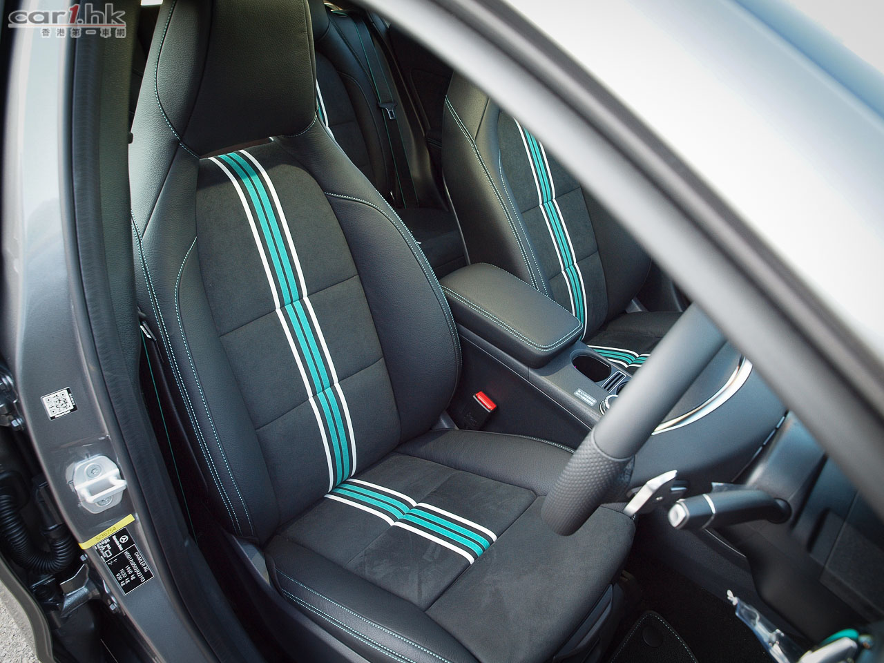 這裡見到的 Motor Sports Edition,是平治玩加入 MERCEDES AMG PETRONAS Formula 1車隊元素的特別版本,車身前後橫間、AMG 鋁合金輪圈的外圍、門邊鏡和 AMG 車頂尾翼的側板用上與平治一級方程式賽車一樣的 petrol green 綠色;車內的冷氣風口外圍,黑皮/Dinamicad 纖維的sports seats和其他皮革地方也有這 petrol green 綠色,需 $42,000 另購,只有 A 200 和 A 250 型號才可裝配。