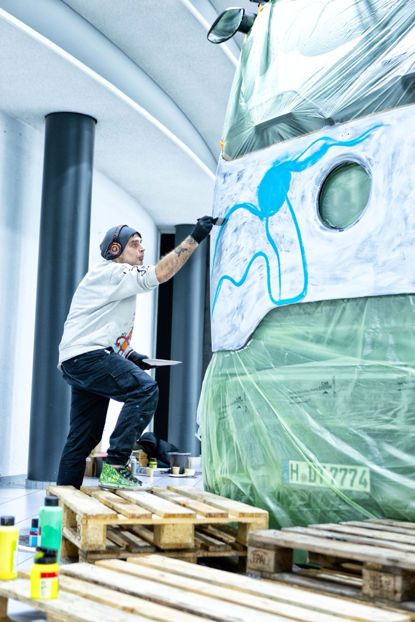 這部獨一無二的藝術卡車,外觀設計完全顛覆傳統。藝術家 Sven Liesy 自 2026 年 1 月中旬開始進駐維修中心,歷時近兩個月的手工創作,於 3 月 10 日正式竣工。設計風格融合了強烈的新表現主義(Neo-expressionism),將抽象的線條與大膽的色彩注入 ProCabin 寬敞的車體表面。Actros L 本身強調的極致風阻效率與空氣動力學線條,在藝術家的筆觸下,非但沒有被掩蓋,反而透過色彩的流動感,強化了車輛在高速行駛時的視覺張力,實現了科技與文化的深層對話。