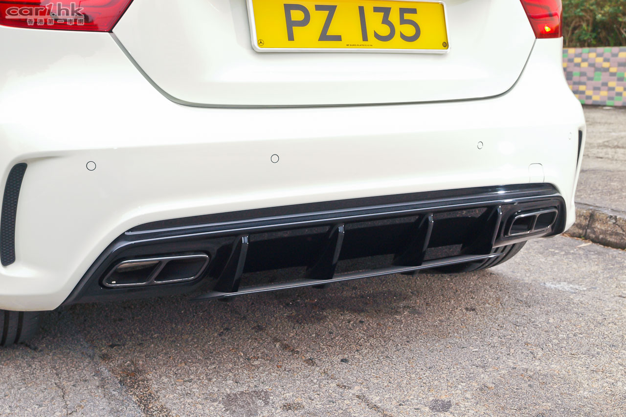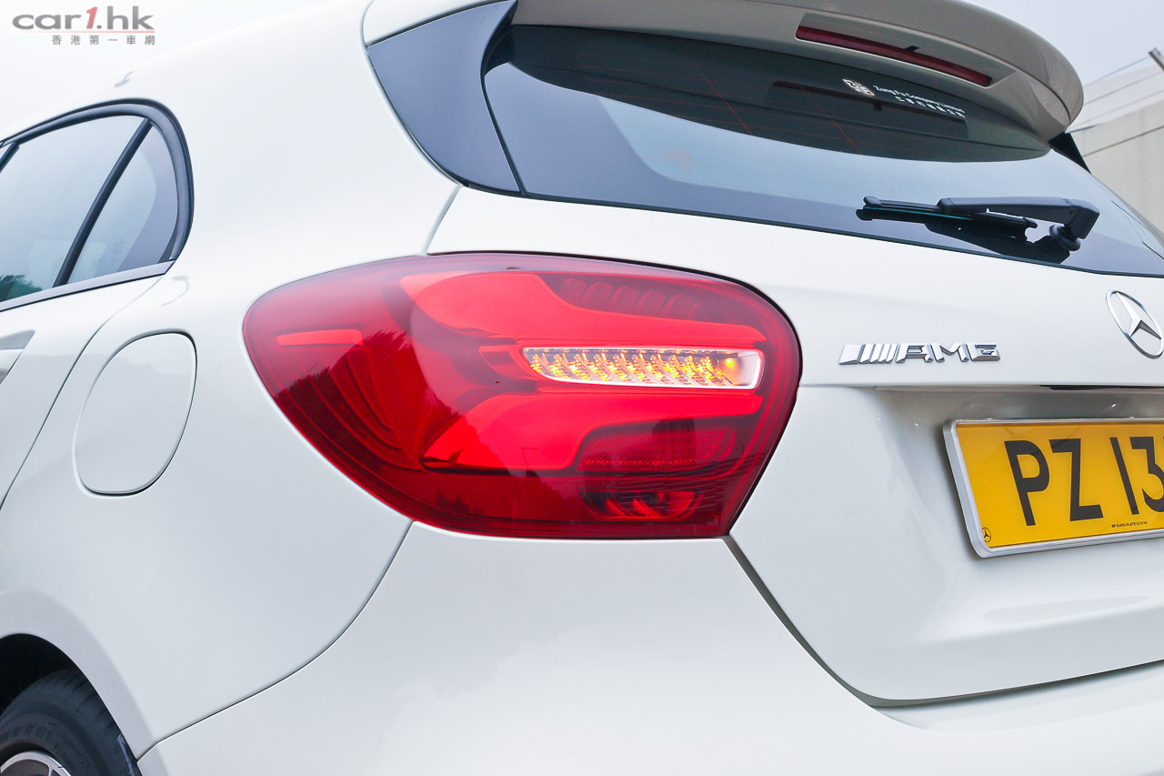 新版 AMG A 45 與車系一樣,新款LED頭燈內有「眼眉」形指揮燈和不同的反光片;早期的尾燈用「C」形的紅燈包著指輝燈,現紅燈部份改成分叉款;AMG 獨有的車身包圍,新款的前泵把由早期的「八」字形魚鰭形狀改為這個「眼鏡」形設計,左右入風口內有兩條黑色橫間,外圍有黑色「C」字形裝飾框,中央下入風口有五條直柱,下有擾流片;舊款尾泵把比較平平板板的黑色網紋部份,現改成更有惡意的四格diffuser和下方擾流片,車側裙腳和四個方形尾喉一樣;車頂擾流翼現加裝小尖喙,連同新前後泵把設計,據說能產生較大下壓力。沙板上的小 logo,由早期「TURBO AMG」字改為「TURBO 4MATIC」。車子原裝用白色「AMG」字的灰色制動卡鉗,這裡的黑「AMG」字紅色卡鉗本是optional選項。Facelift少不了的,還有新款十柱形18吋輪圈 (用 235/40 R18 輪胎);另有 19 吋 option (用 235 / 35R 19胎)。
