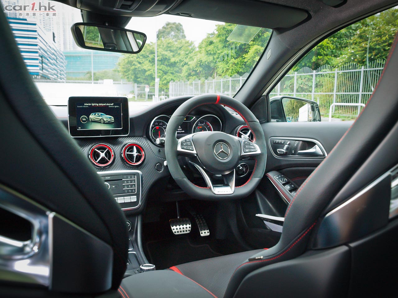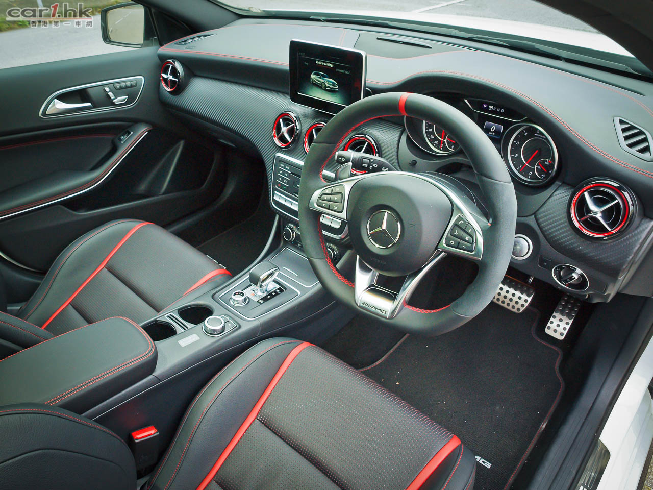車廂小改地方與其他 A-Class 一樣,之前扁平的兩個儀錶,現由「望遠鏡」形的圓筒包圍,錶面圖案和指針是新設計,AMG 版有碳纖紋內圈;儀錶間的顯示屏由黑白變為彩色顯示屏;軚盤軸上的水撥/指揮燈棒,以及門邊的電椅調校制改用電鍍銀色按鈕;改大至 8 吋闊的中控台彩色顯示屏,顯示的圖案與 A-Clas s小改後的一樣,功能表內同樣有 12 種顏色、5 段光暗的車廂氣氛燈光 ambience lighting;壓有 AMG 盾徽的波棍頭維持一樣,波棍後的轉盤制,是早期款沒有的 Dynamic Select 駕駛反應系統,現新版 A 45 也跟小改後的 A-Class 一樣設有,不再像以往只得波箱揀 C、S 和 M,而普通 A-Class 有的「Comfort」、「Sport」和「Eco」模式,A 45 則有「Comfort」、「Sport」和「Sport+」來改變引擎/波箱快慢、軚盤輕重以及ESP穩定系統介入狀態;各模式中,「Comfort」新加有 60-160km/h 間引擎與波箱分離的 sailing 滑行功能,ECO start/stop 自動生效;「Sport」加快引擎/波箱反應,有電腦控制的活瓣的 AMG sports exhaust 系統聲音變厚;「Sport +」有最快轉波時間,懂拖波補油,油門反應最靈敏,直噴和點火系統在轉高波時會稍為停一停滯,讓波箱更快接合;第 4 個「Individual」自定模式可揀引擎快慢,波箱手動或自動轉波,以及ESP系統 Comfort 長著、Sport 容許甩尾或是 Off 關調。車子的裝飾色調則與早期款一樣,有碳纖紋錶板、紅色安全帶和冷氣出風口框,連頭枕的 AMG 座椅沒有變改;軚盤則改為下方扁平的「D」字軚。