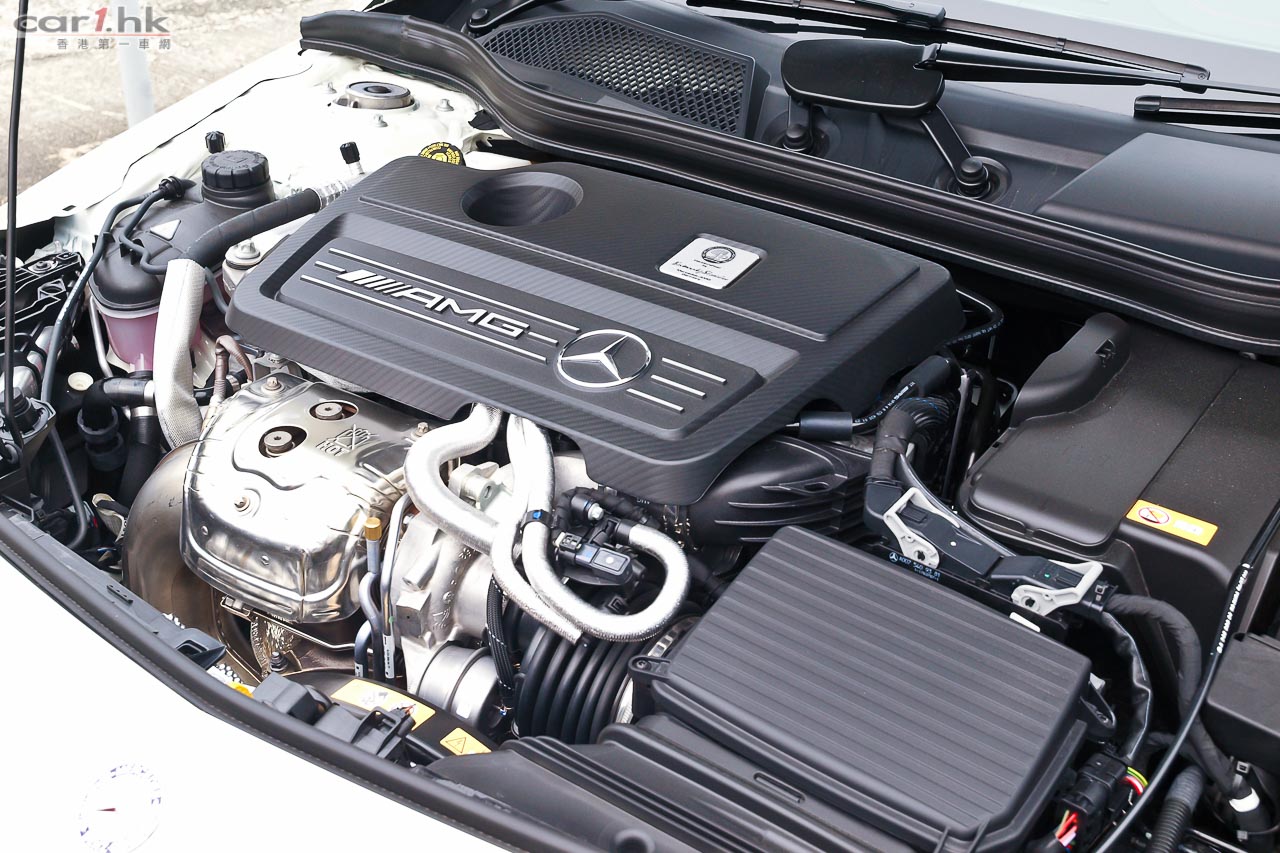 A 45 採用的首個 AMG 四汽缸引擎,本身已是同類引擎中全球輸出最高,其特點有鋁crankcase曲軸盤,鍛造凸輪軸和活塞,抗磨活塞環和 NANOSLIDE 抗磨汽缸套,turbo 採用 twin-scroll 進氣技術,兼有小巧的turbo housing和短進氣管道,直噴系統每次衝程可多次噴注和多次點火,現改用經「優化」的汽缸頂、點火時間和渦輪增壓器,渦輪壓力雖然最高仍是 1.8 bar,6,250rpm 紅線沒變,但輸出由早期 360 匹和 450 牛頓米谷高至 381 匹和 475 牛頓米。7 前速 AMG SPEEDSHIFT DCT 雙離合器波箱,現 3 至 7 波比率改得更短,即轉數跌得更少。
