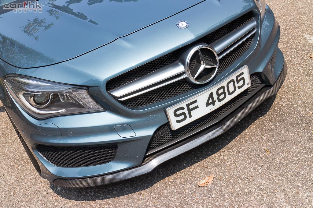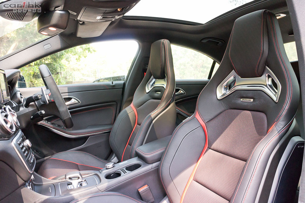 CLA 45 AMG 作為車系最強成員,外型分外威武,在原 CLA 車型變身下,全車裝有專屬的 AMG 碳纖款式包圍和兩側鏡殼,還有四出梯形電鍍尾喉及 18 吋多幅式合金輪圈,但最搶眼的反而是頭沙板有著「AMG Turbo」的徽章。 而車廂佈局同樣充滿動感,全車配上鮮艷的紅色安全帶,再加上紅黑雙色的桶形皮革跑車椅及真皮的多功能平底方向盤,完全釋放強烈的跑車風格。