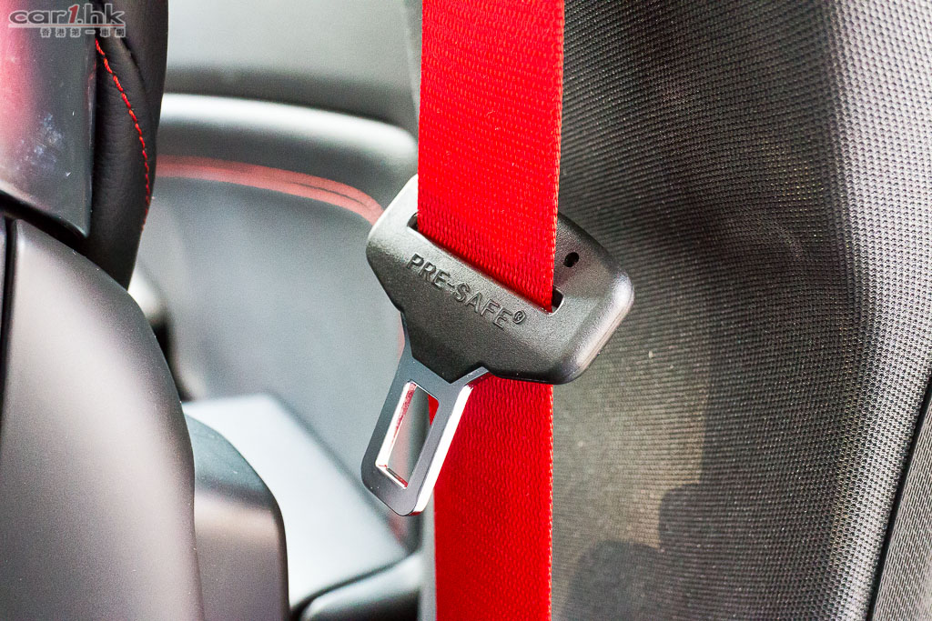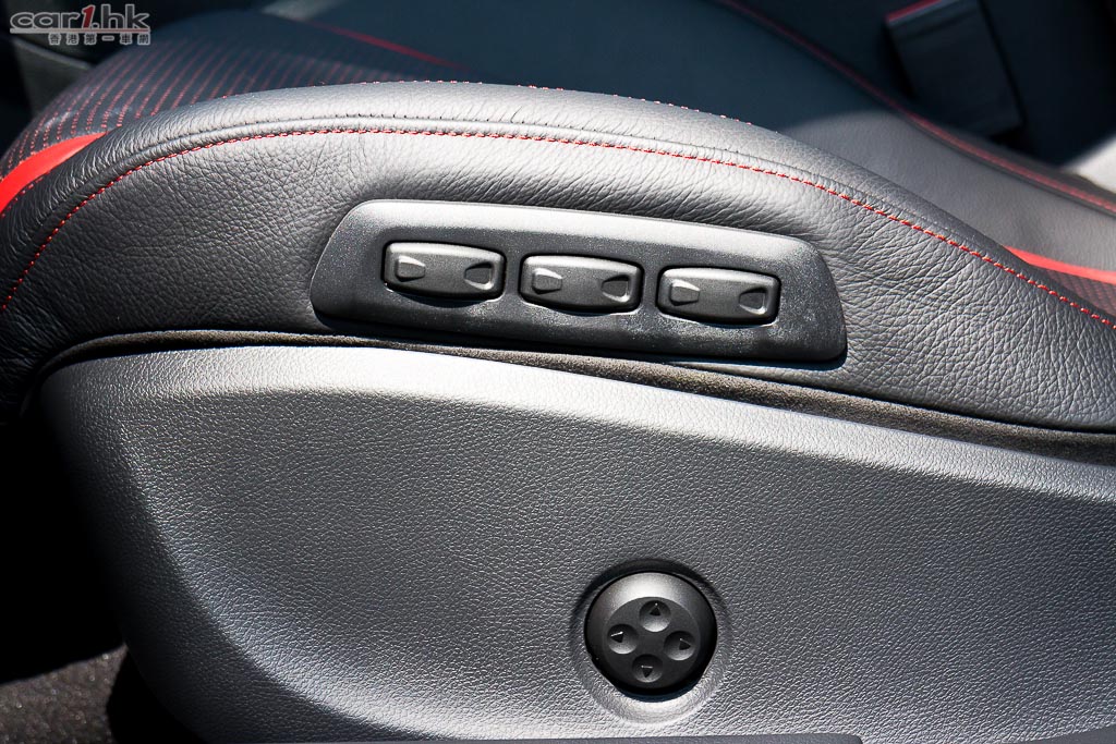 座椅使用 two-tone 設計再加上紅色的安全帶,令車佈充滿濃厚的賽車風格。