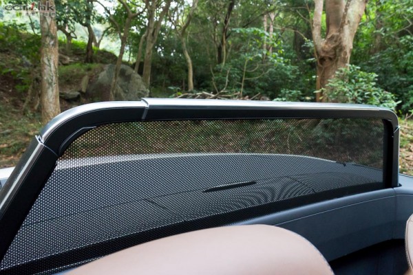 (左)車椅後方設有風擋,可減低開篷後駕駛時的風嘈。(右)錶板設計沿用平治跑車設計風格,雙錶圏、白底、紅針,極度搶眼。