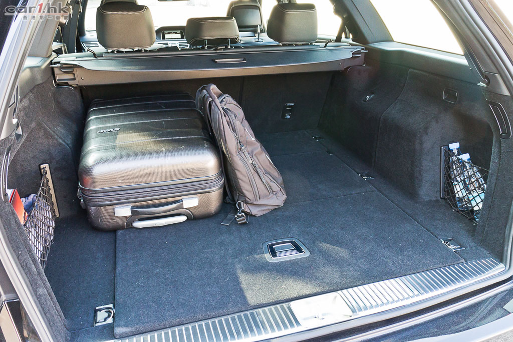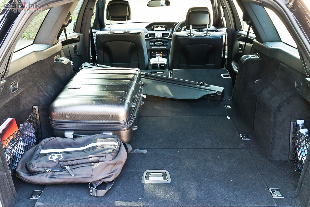 作為豪華旅行車,E-Class Estate 有闊和低的尾門開口,又長又深的行李箱空間,整個行李箱舖滿厚厚的地毯,左右兩旁有繩網載物格,活動式的行李箱掩篷可沿後柱路軌升降,以及電動升降尾門。