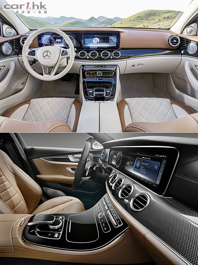 E-Class 的內裝和 MultiBeam LED 頭燈設計大家都已經見慣見熟,不過第十代的 E-Class 風阻系數低至 0.23,使用平治 MRA 底盤架構,大量應用高強度鋼材及鋁合金,同時為車子減磅 100 公斤,慳油同時提升操控性。新車尺碼加大了,比舊版長了 43mm,達到 4,923mm,軸距亦長了 65mm(2,930mm),對車內的空間、行車的穩定性有很大幫助。車體大了的 E-Class,以中型行玫房車來說,對提升它的氣派感覺和高貴感覺會有一定幫助。而新的 MultiBeam LED 頭燈以 84 棵 LED 打造而成,目的是在路上提供更好的照明系統,保障路面使用者的安全性。而中駕駛艙的錶板和中控台以兩個大型 12.3 吋 LED 合拼而成,用作錶板和中控台設定顯示。車內的中控台系統,支援了 Apple CarPlay 和 Google Android Auto 系統,可以輕鬆將手機資料應用到汽車中控台之中。